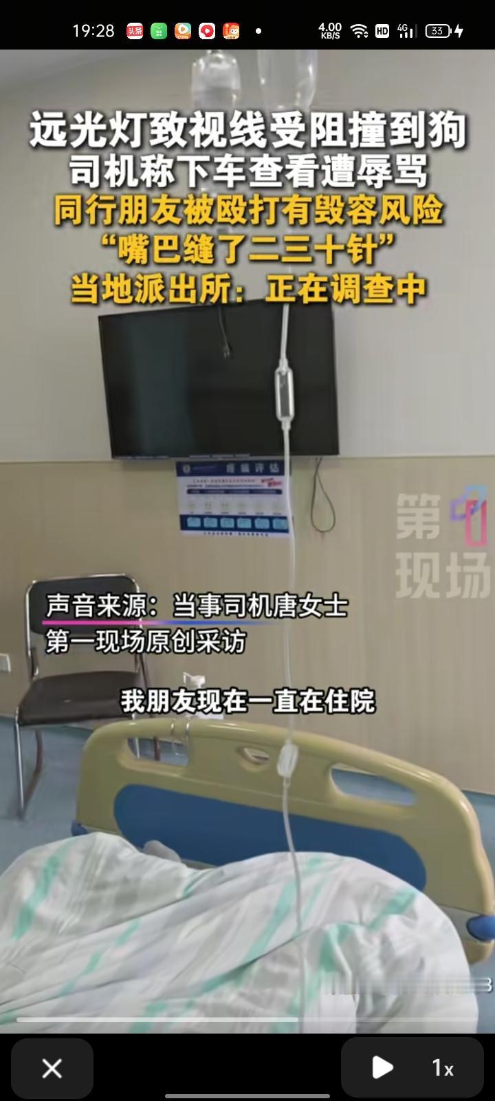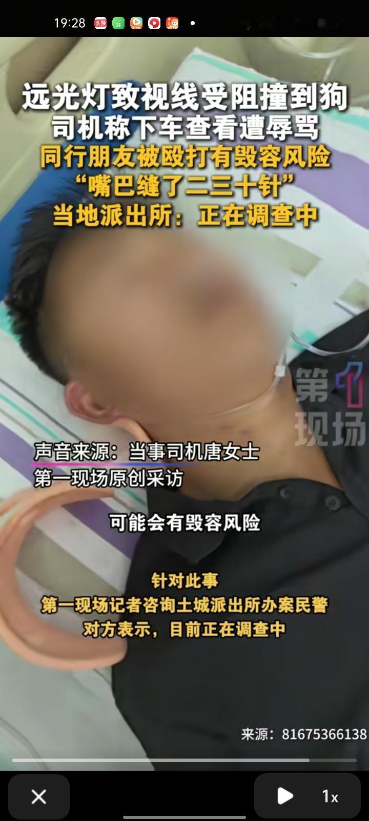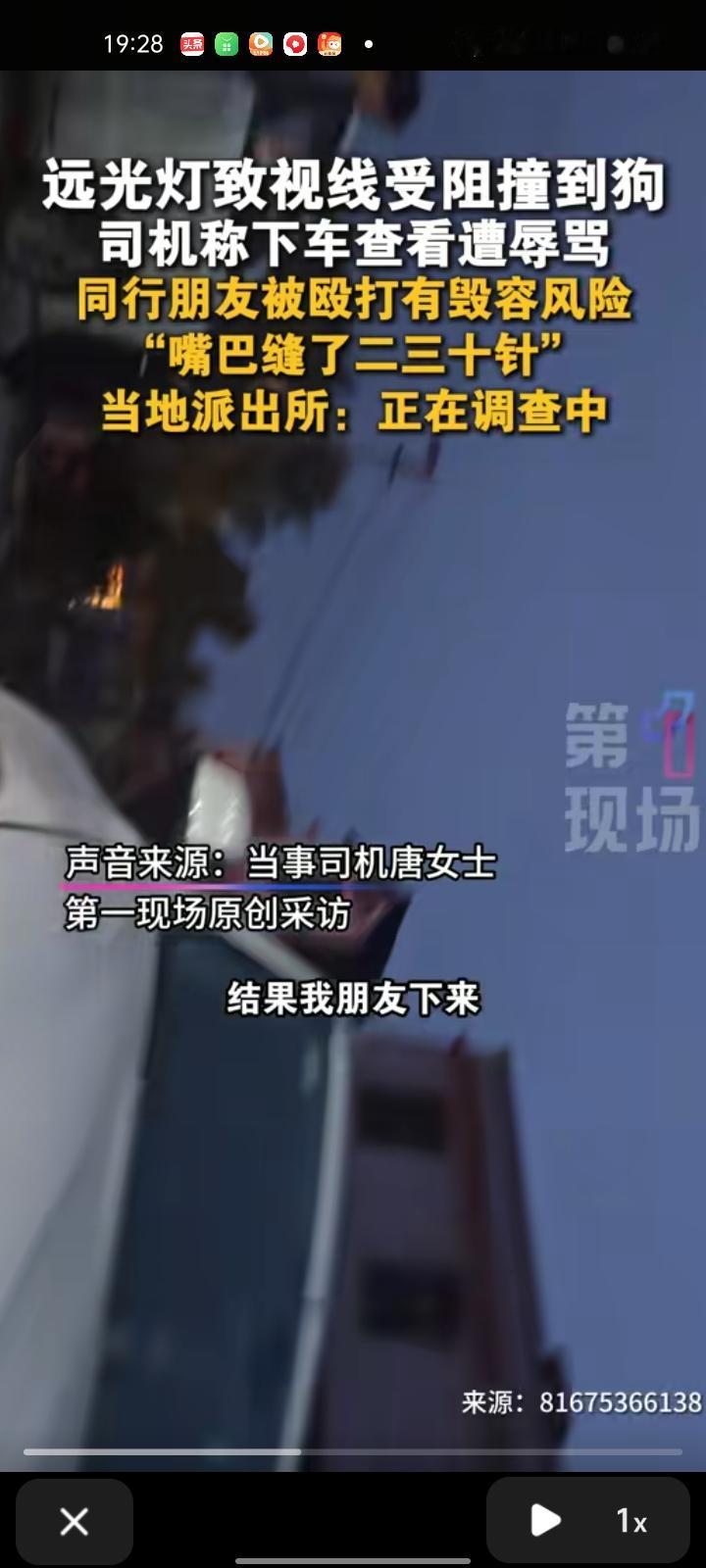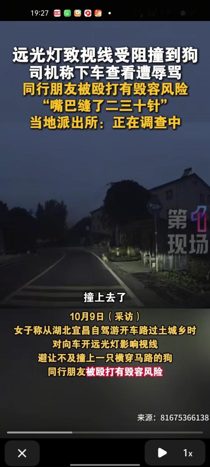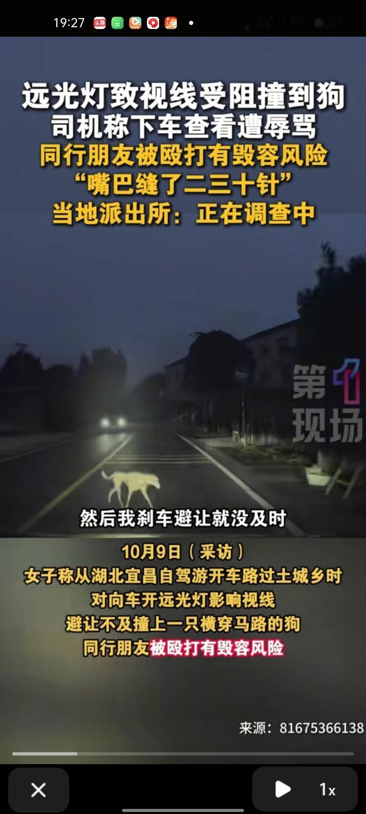 10月5日,湖北宜昌。唐女士称,从湖北宜昌自驾游开车路过土城乡时,对向车开远光灯影响视线,避让不及撞上横穿马路的狗。她和朋友下车查看时,遭到狗主人及朋友的辱骂和殴打,她和朋友的手机被抢走,朋友的嘴巴被打开裂,被缝了二三十针。目前已报警,派出所正在对此事进行调查。
