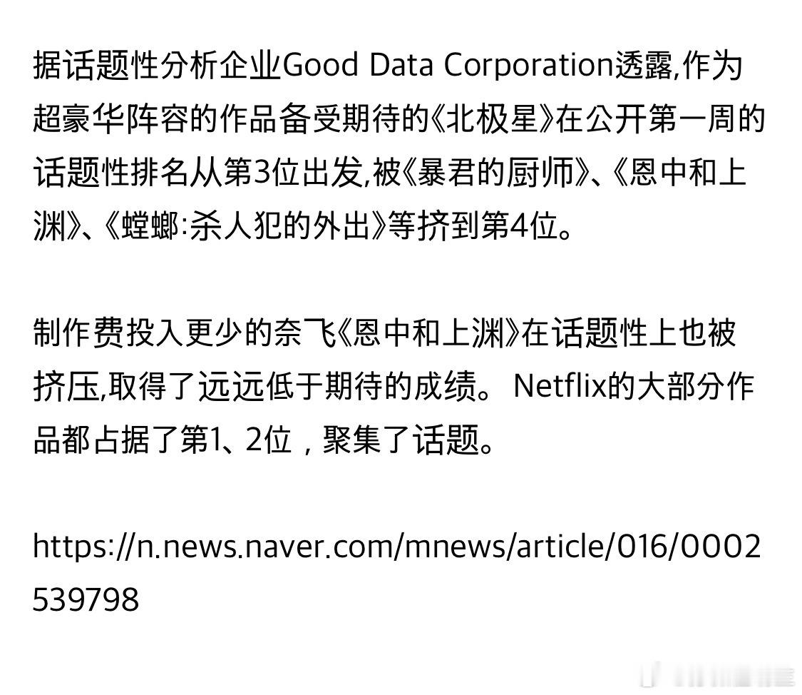 《北极星》的市场表现远未达预期。业内评价指出考虑到该剧主演每集片酬高达4亿韩元,总制作成本约500亿韩元,这样的成绩堪称惨败。