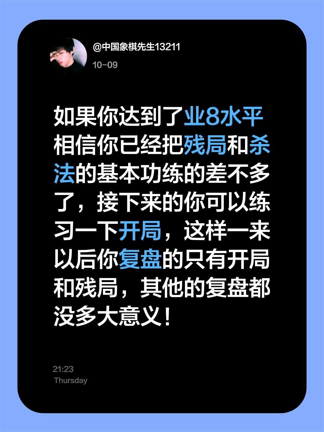 象棋业8后遇到瓶颈怎么办?如果你达到了业8水平相信你已经把残局和杀法的基本功练的差不多了,接下来的你可以练习一下开局,这样一来以后你复盘的只有开局和残局,其他的复盘都没多大意义!象棋 知识分享 创作者扶持计划