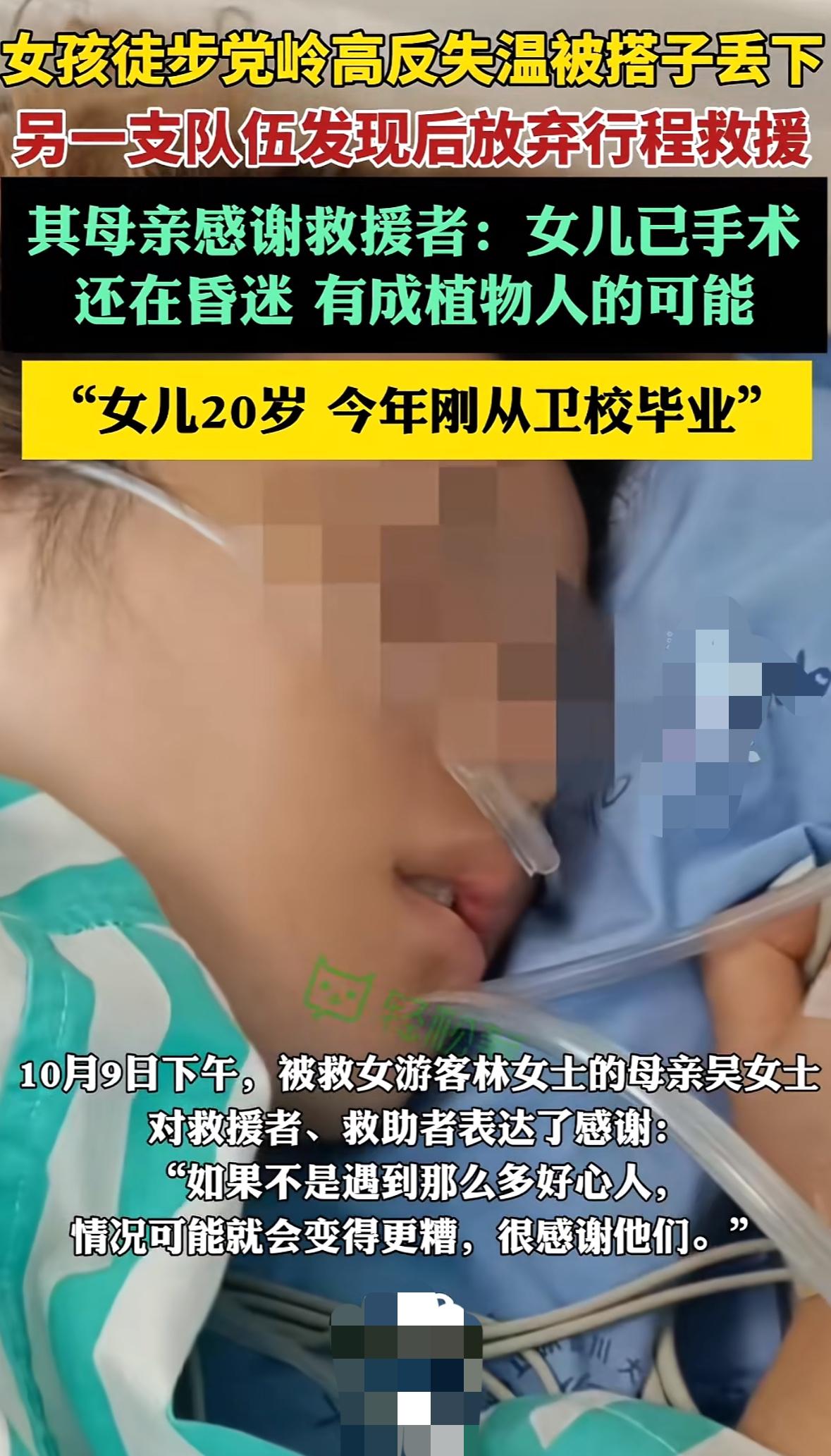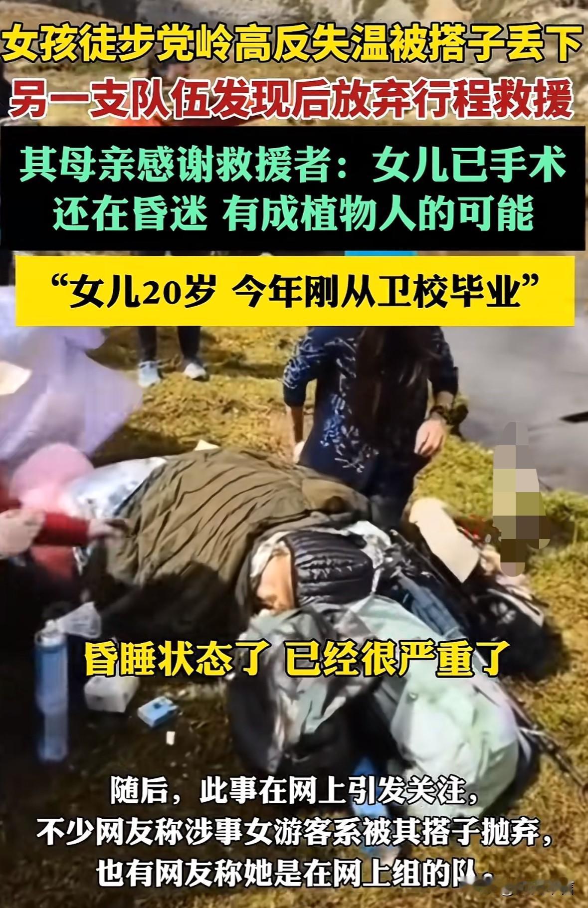 千万不要与陌生人一起去旅游!江苏盐城一名刚卫校毕业的女生在四川甘孜徒步“高反”被搭子丢下,命悬一线之际幸好被另一队伍发现,不过她可能会成为植物人 目前尚不知丢下她的搭子是认识的朋友,还是如网友所说在网上认识临时组队的,但不管如何,丢下有生命危险的人一走了之肯定是不对的 如今医生说女生可能会苏醒,也可能会成为植物人,如果真的成为了植物人,那这些丢下她的搭子就要负法律责任 同桌喝酒如有人意外身亡,陪同的人都要承担责任,更别说这种故意丢下有生命危险的人了 所以千万不要相信网上的旅游搭子组团,说不定在关键时刻他就会离你而去!