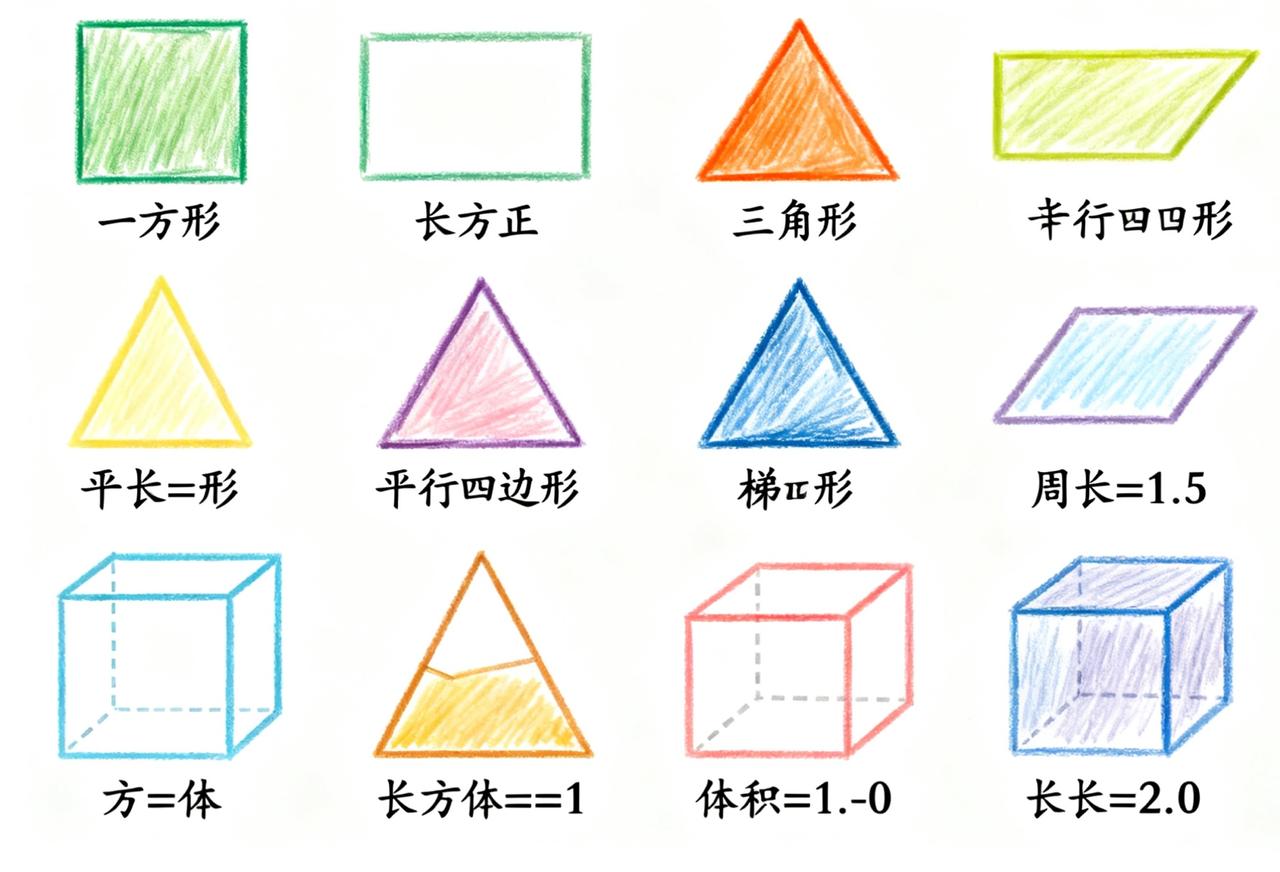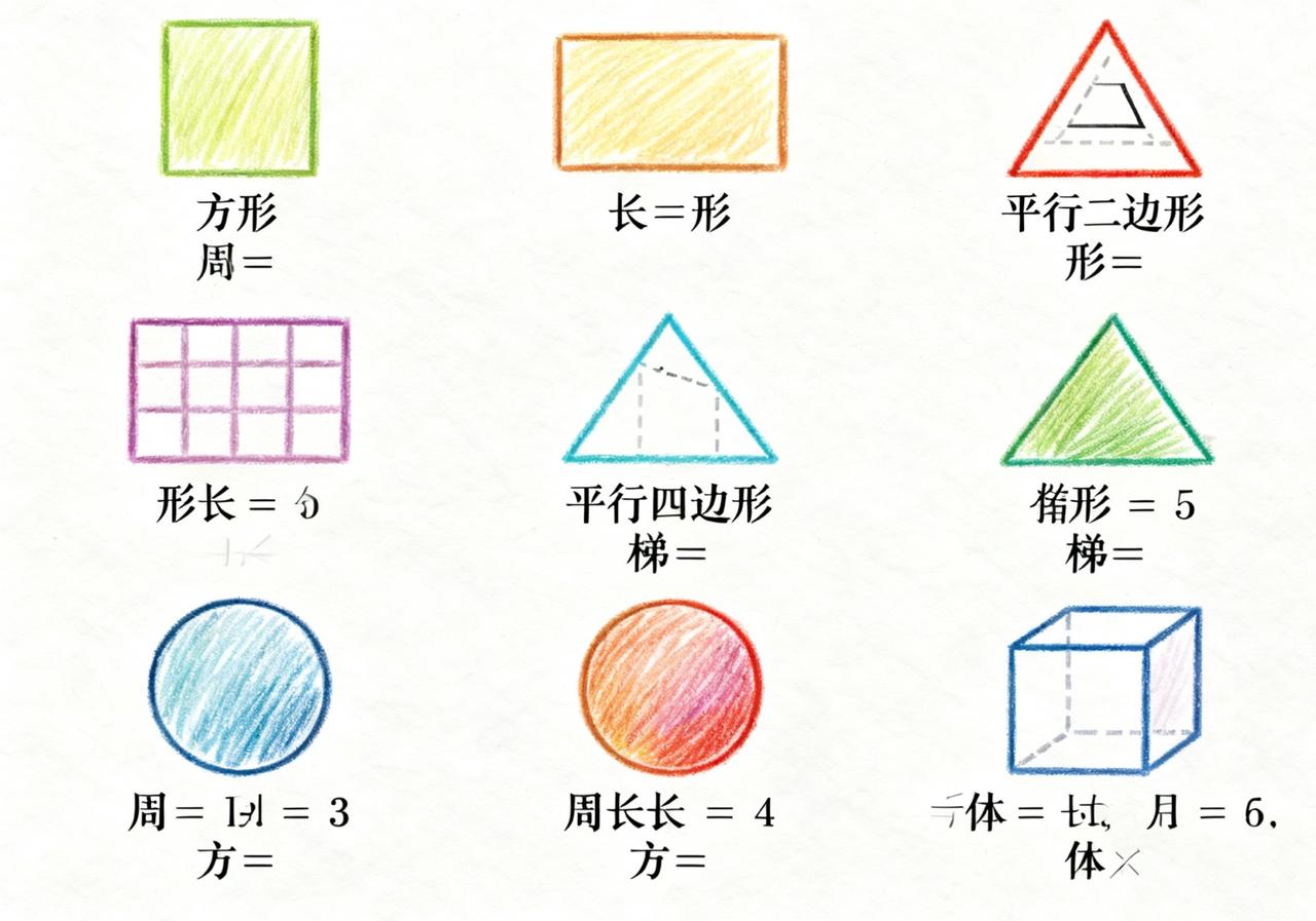 有了这个小学几何公式大全,方便孩子随时查看,家长再也不用担心孩子到底会不会了,强烈建议大家赶紧收藏起来方便需要时及时查看。 小学几何公式大全 一、平面图形(周长、面积) • 正方形: ◦ 周长 = 边长 × 4(C = 4a) ◦ 面积 = 边长 × 边长(S = a×a = a²) • 长方形: ◦ 周长 =(长 + 宽)× 2(C = 2(a + b)) ◦ 面积 = 长 × 宽(S = a×b) • 三角形: ◦ 周长 = 三条边长度之和(C = a + b + c) ◦ 面积 = 底 × 高 ÷ 2(S = ah÷2) • 平行四边形: ◦ 周长 =(邻边之和)× 2(C = 2(a + b)) ◦ 面积 = 底 × 高(S = ah) • 梯形: ◦ 周长 = 四条边长度之和(C = a + b + c + d,a、b为上下底,c、d为腰) ◦ 面积 =(上底 + 下底)× 高 ÷ 2(S = (a + b)h÷2) • 圆形: ◦ 周长 = 2×π×半径(C = 2πr)或 π×直径(C = πd),π≈3.14 ◦ 面积 = π×半径×半径(S = πr²) 二、立体图形(表面积、体积) • 正方体: ◦ 表面积 = 棱长 × 棱长 × 6(S = 6a²) ◦ 体积 = 棱长 × 棱长 × 棱长(V = a×a×a = a³) • 长方体: ◦ 表面积 =(长×宽 + 长×高 + 宽×高)× 2(S = 2(ab + ah + bh)) ◦ 体积 = 长 × 宽 × 高(V = abh)或 底面积 × 高(V = Sh)