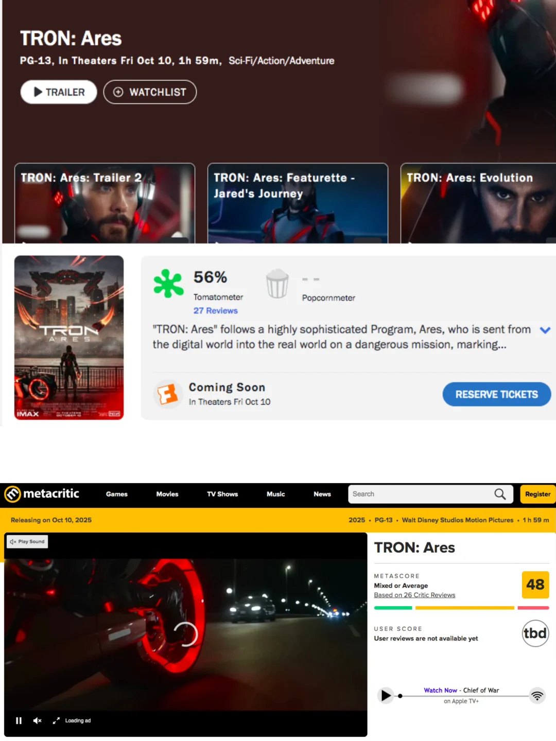 😓 迪士尼时隔多年推出的续集超级大片《创:战神》媒体口碑出炉,烂番茄56%的新鲜度让人捏一把汗,MTC也只有48分,属于不及格的水平。