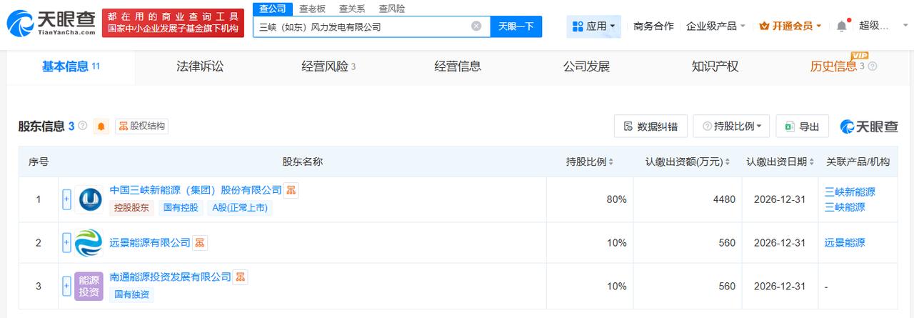 三峡能源等在江苏南通成立风力发电公司注册资本5600万 天眼查App显示,近日,