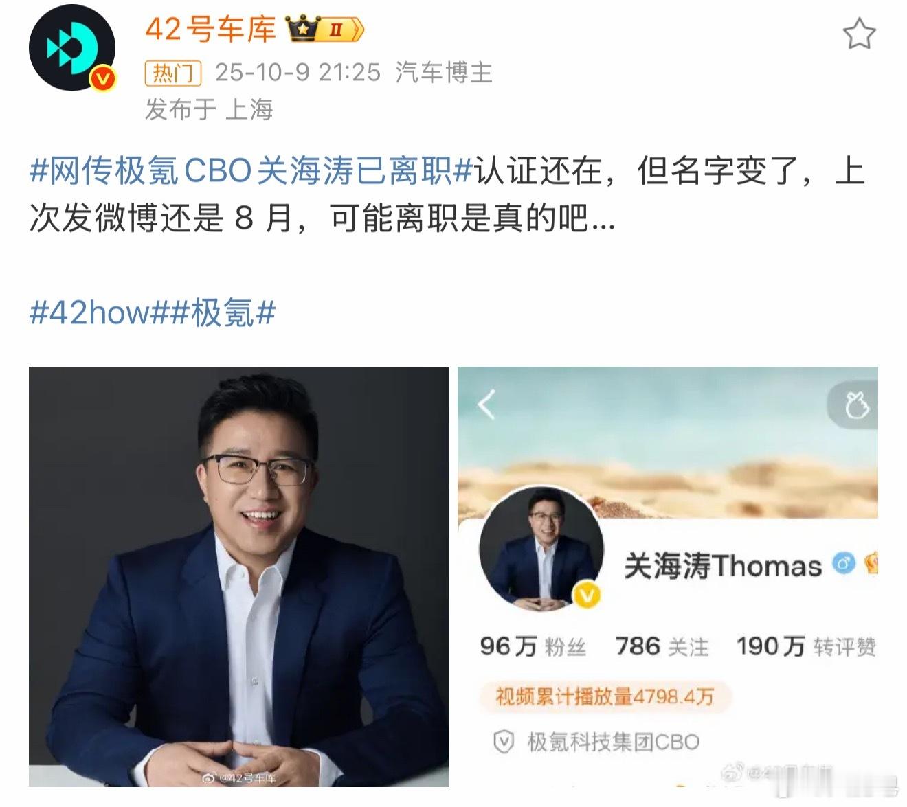 网传极氪CBO关海涛已离职名字改了,但还不确定是不是真的离职了。等吉利那边官方