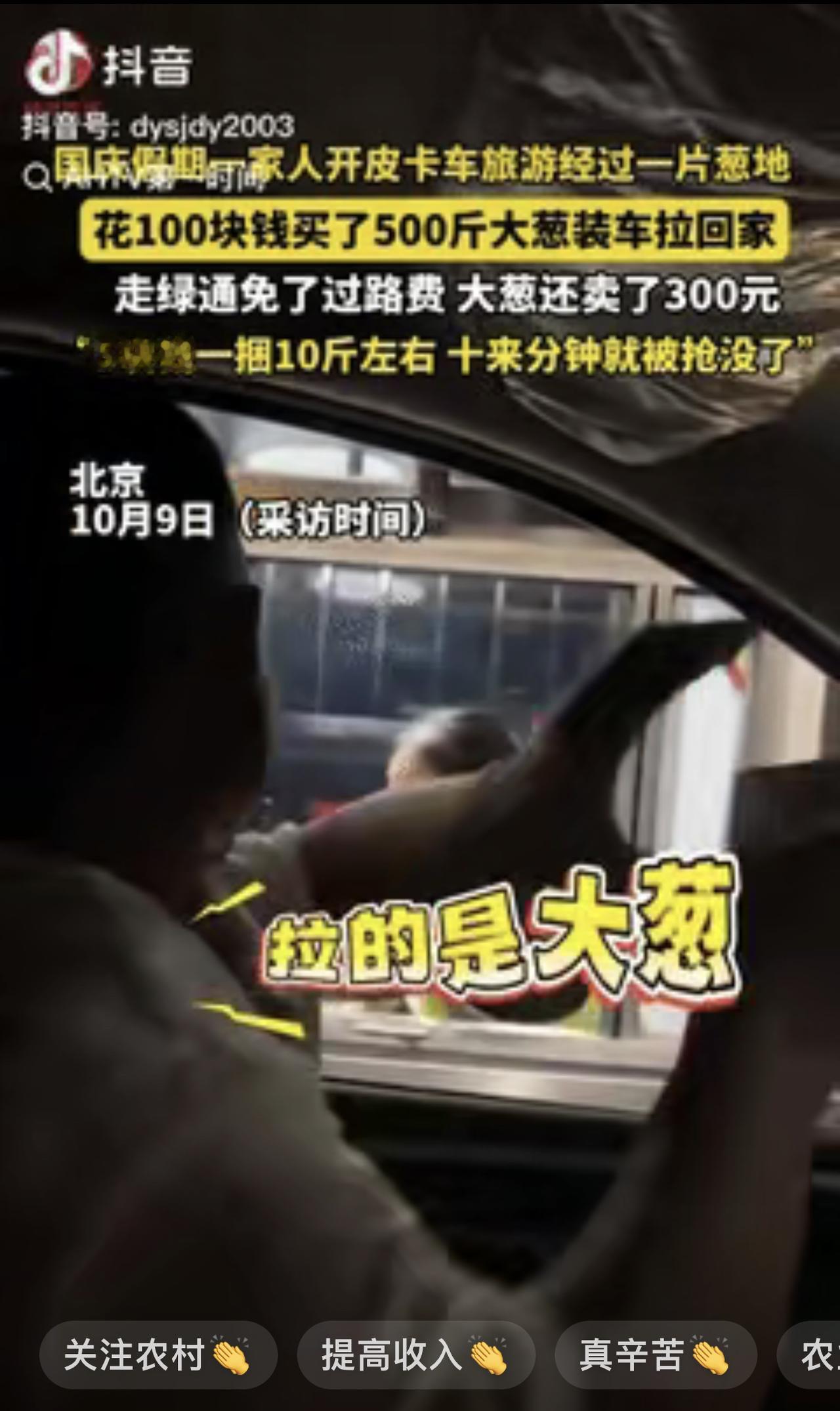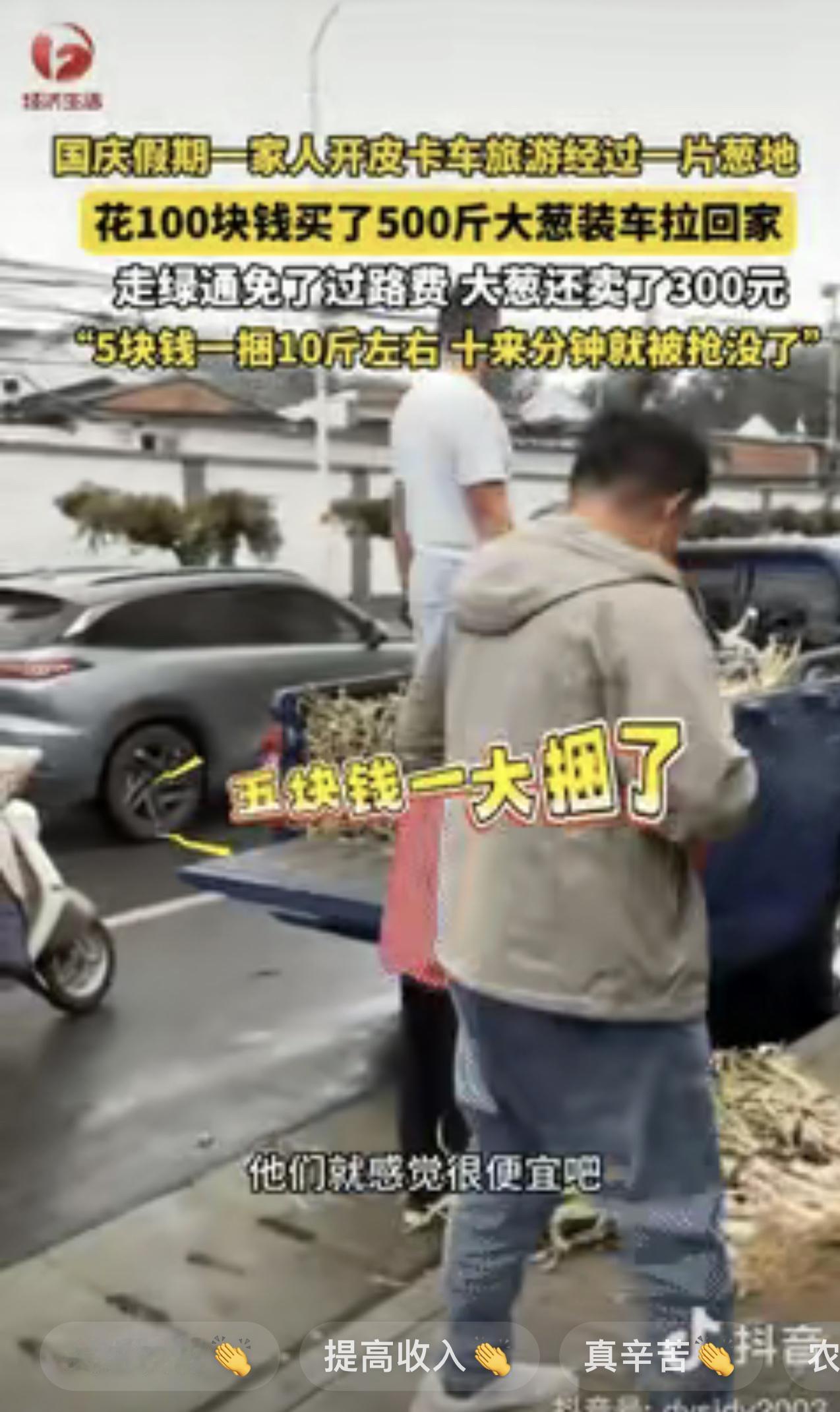 北京这位大哥, 用100块钱买了500斤葱,不仅免了107块过路费,最后还卖了300块,净赚200多。但更关键的是,他帮农户解决了卖葱难题。 农户的葱长得好,却只能卖2毛一斤,不卖出去更亏。大哥正好有皮卡车,还懂绿通政策,一下就盘活了这笔生意。他没趁火打劫压价,农户也愿意快速变现,这是一场你情我愿的公平交易。 这事儿之所以让网友觉得"聪明",是因为它不是零和博弈。大哥没损害农户利益,反而创造了新价值。他利用自己的资源和信息差,既帮了别人,也让自己获利。