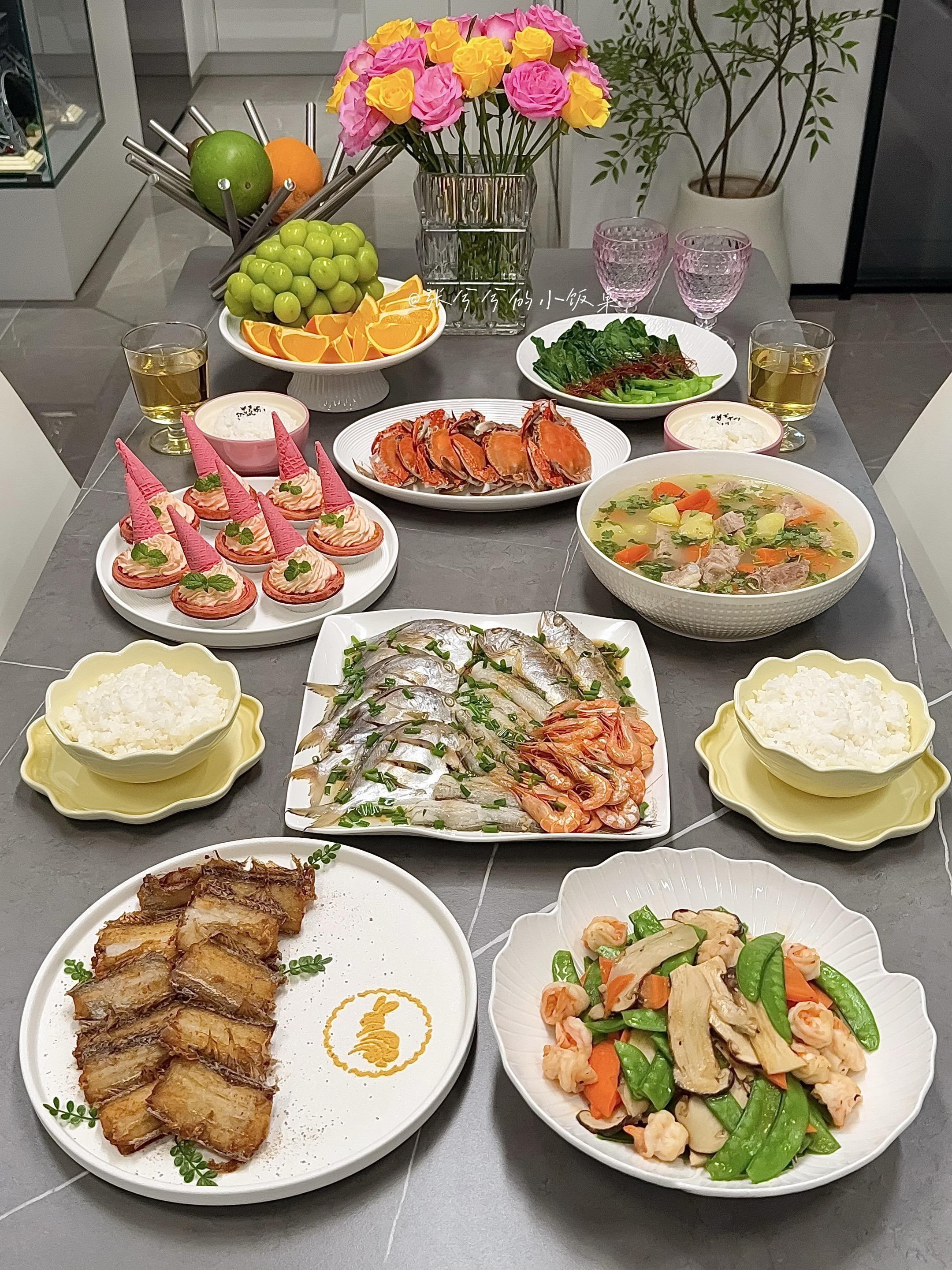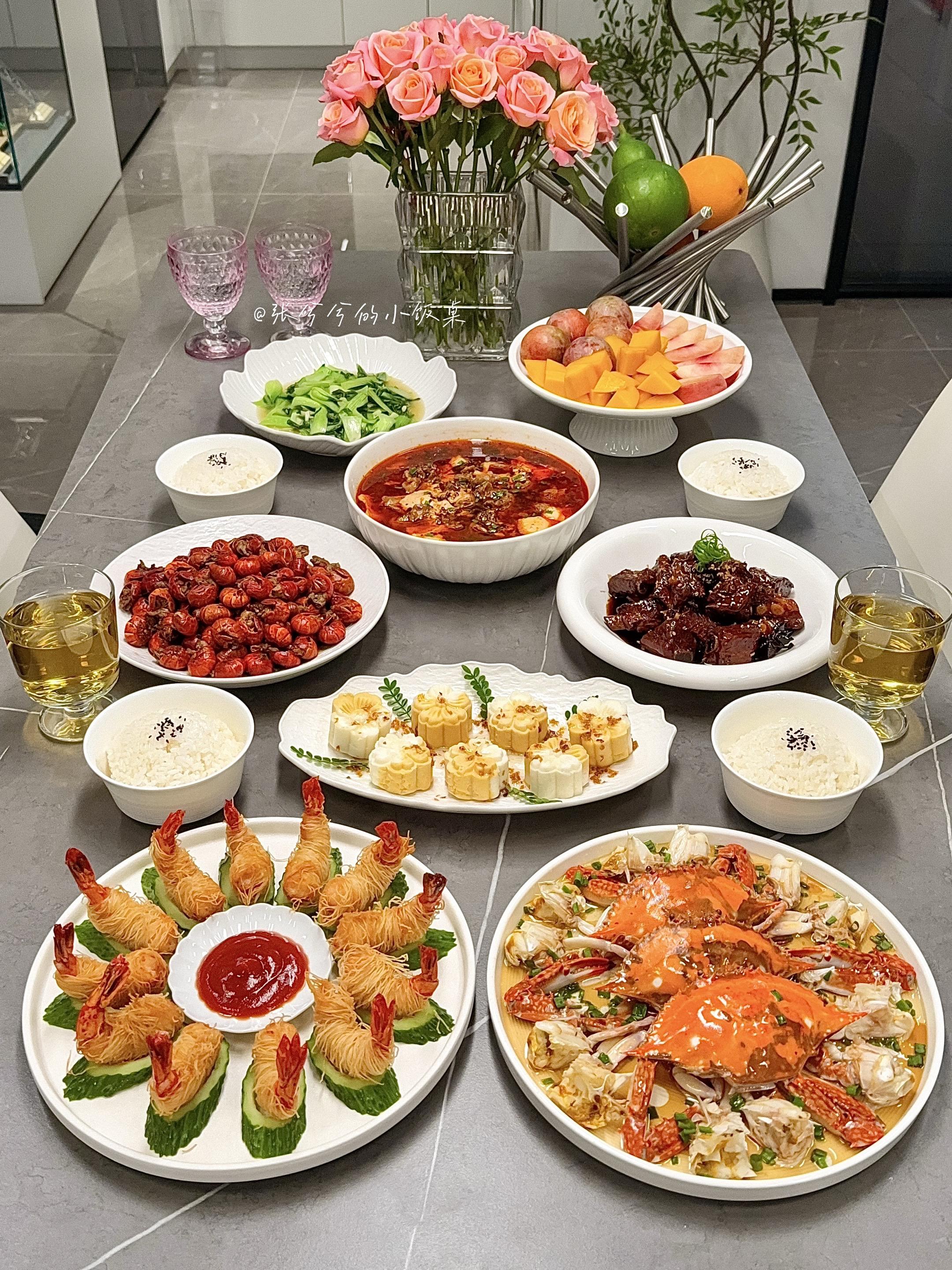 美食合集|简单快手的高颜值家常菜。图1️⃣:桂花山药➕千丝万缕虾➕葱油梭子蟹➕桂花小排➕豆花牛肉➕麻辣龙虾尾➕蒜蓉上海青