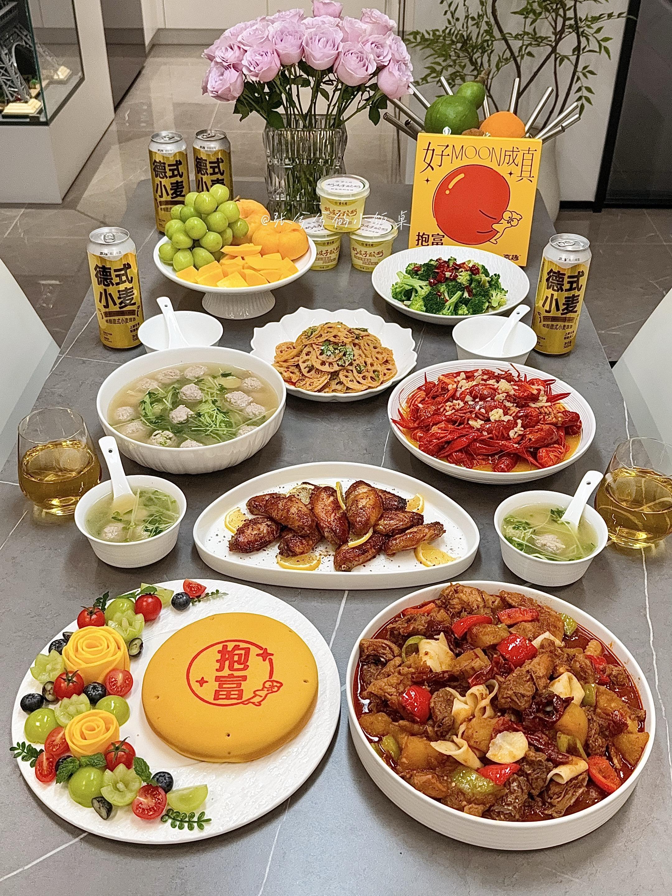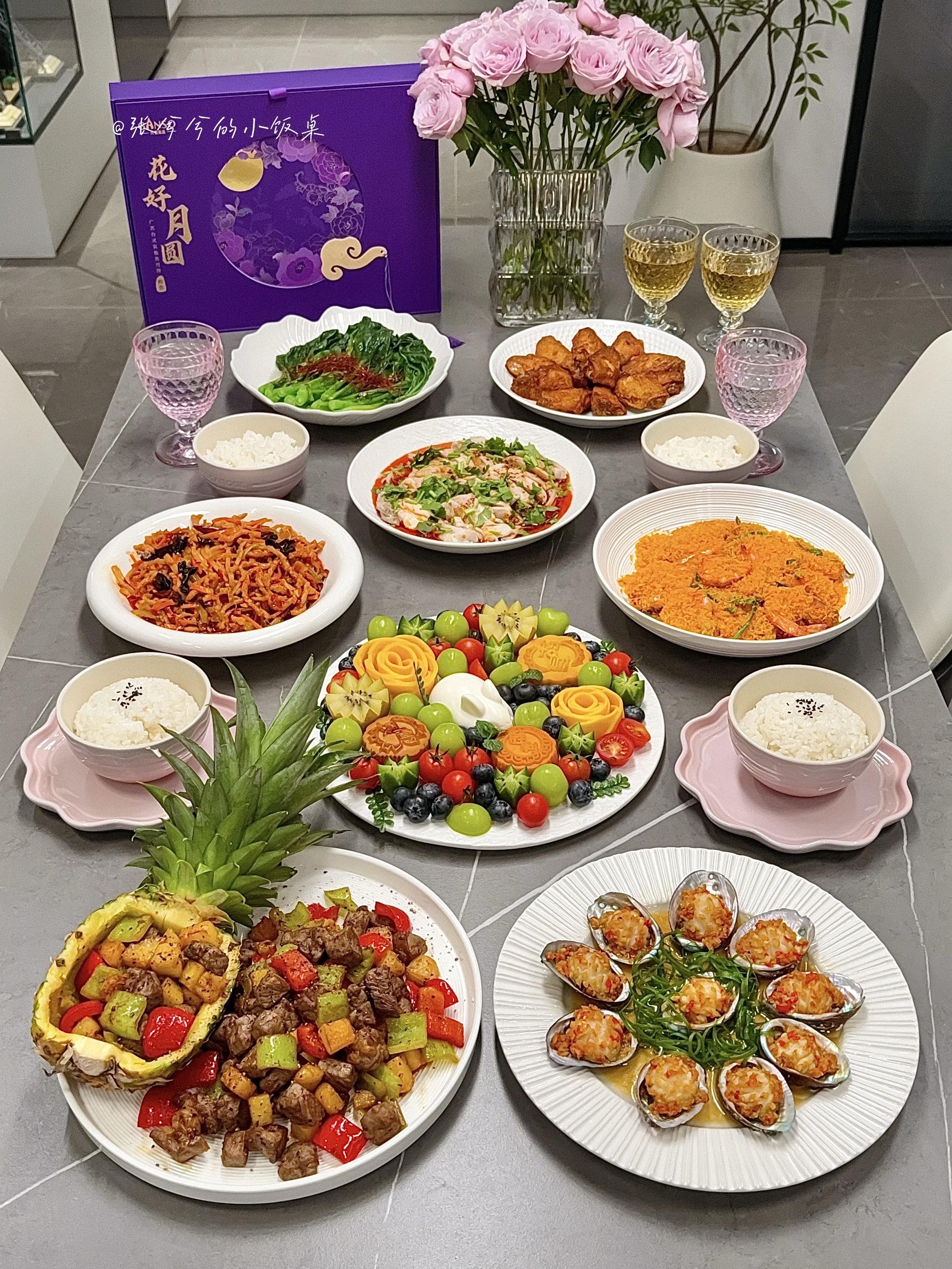 图5️⃣:月饼水果拼盘➕黑椒菠萝牛肉粒➕蒜蓉蒸鲍鱼➕避风塘炒虾➕鱼香肉丝➕口水鸡➕热辣烤翅➕白灼菜心
