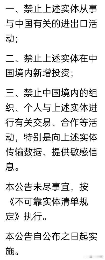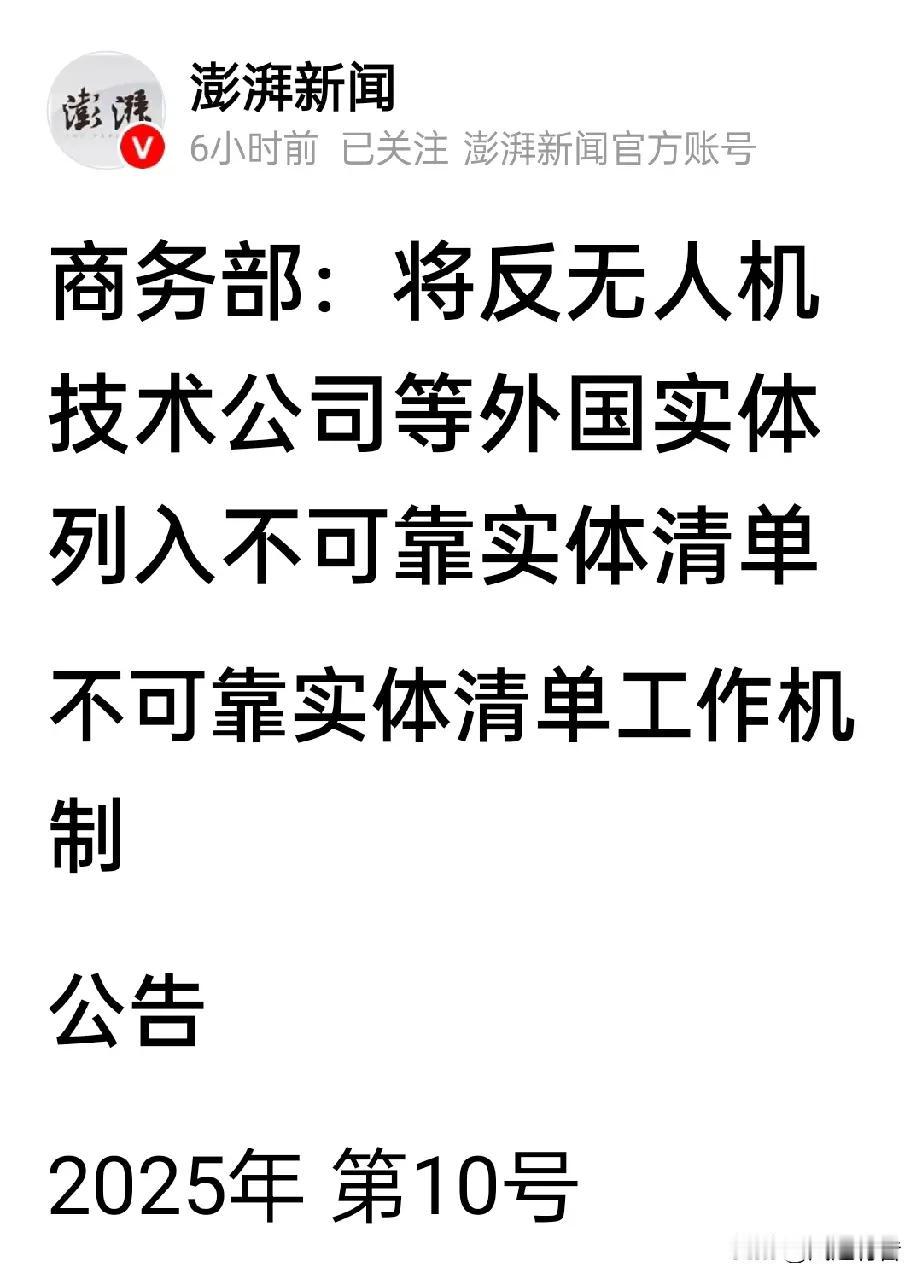 一边在中国做生意赚取经济利益,另一边却干着损害中国利益的事情,不制裁你制裁谁呢? 国庆长假后第一个工作日,商务部就搞了一个大动作,一口气将包括反无人机技术公司、哈利法克斯国际安全论坛等14个外国实体列入不可靠实体清单,并采取了相应的制裁措施。 这些外国实体为什么会受到制裁?商务部发言人交代的清清楚楚:这些实体分别与台开展所谓军事技术合作、发表涉华恶劣言论、协助外国政府打压中国企业,严重损害中国国家主权、安全和发展利益。 以前都是别人制裁我们,现在我们也学会以其人之道还治其人之身了。