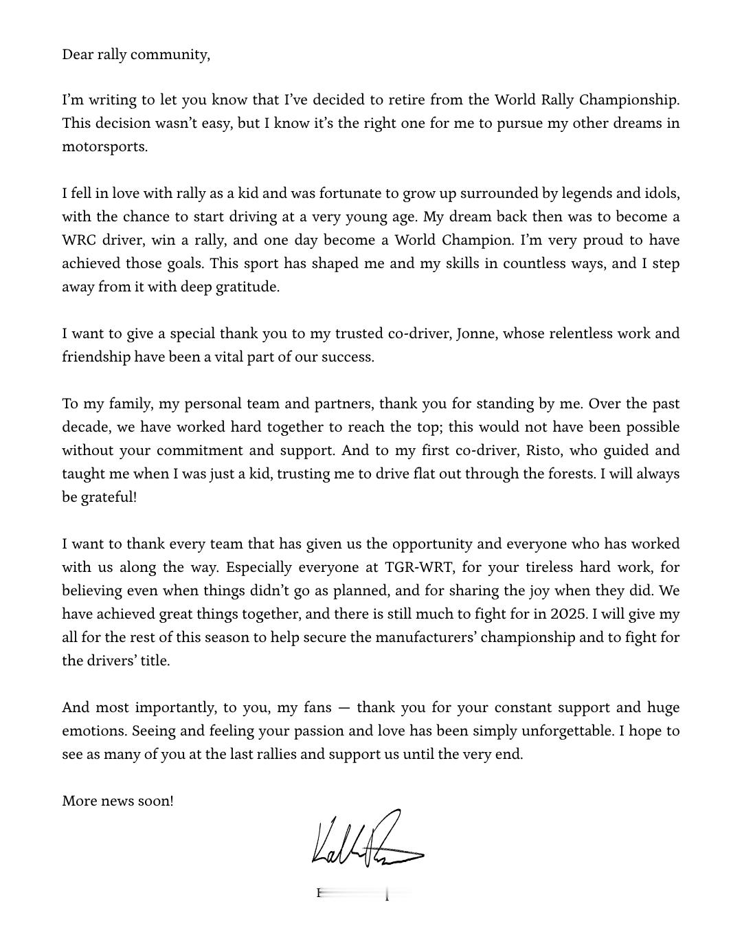 拉力“天才少年”卡勒·罗万佩拉决定在本赛季结束后从WRC退役,转向开轮方程式,开始新的职业生涯。2026赛季他将参加Super Formula,着眼于未来进军F1。