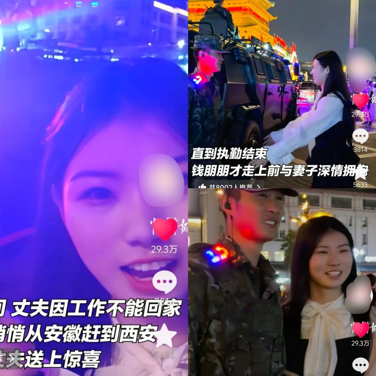 这波双向奔赴太好哭了! 安徽军嫂跨八百里追爱,丈夫的反应藏着最戳人的深情。 国庆不能团圆,潘红干脆从安徽坐车冲到西安,就为给执勤的丈夫钱朋朋一个惊喜。可真见了面,穿着军装的他就愣了一下,立马转回身子继续站得笔挺,半句多余的话都没有。 有人说这反应太“冷”,可懂的都懂,那瞬间的错愕早把思念藏不住了。他守的是万家灯火的哨位,不能因儿女情长分心;她站在人群里微笑等待,早把“理解”刻进了骨子里。直到执勤结束,他快步冲过去的拥抱,才把克制的爱意全释放出来。 这哪是简单的见面啊,分明是成年人爱情里最踏实的模样——你守大家,我守你,不用甜言蜜语也懂彼此的重量。你们见过最动人的双向奔赴是啥样?