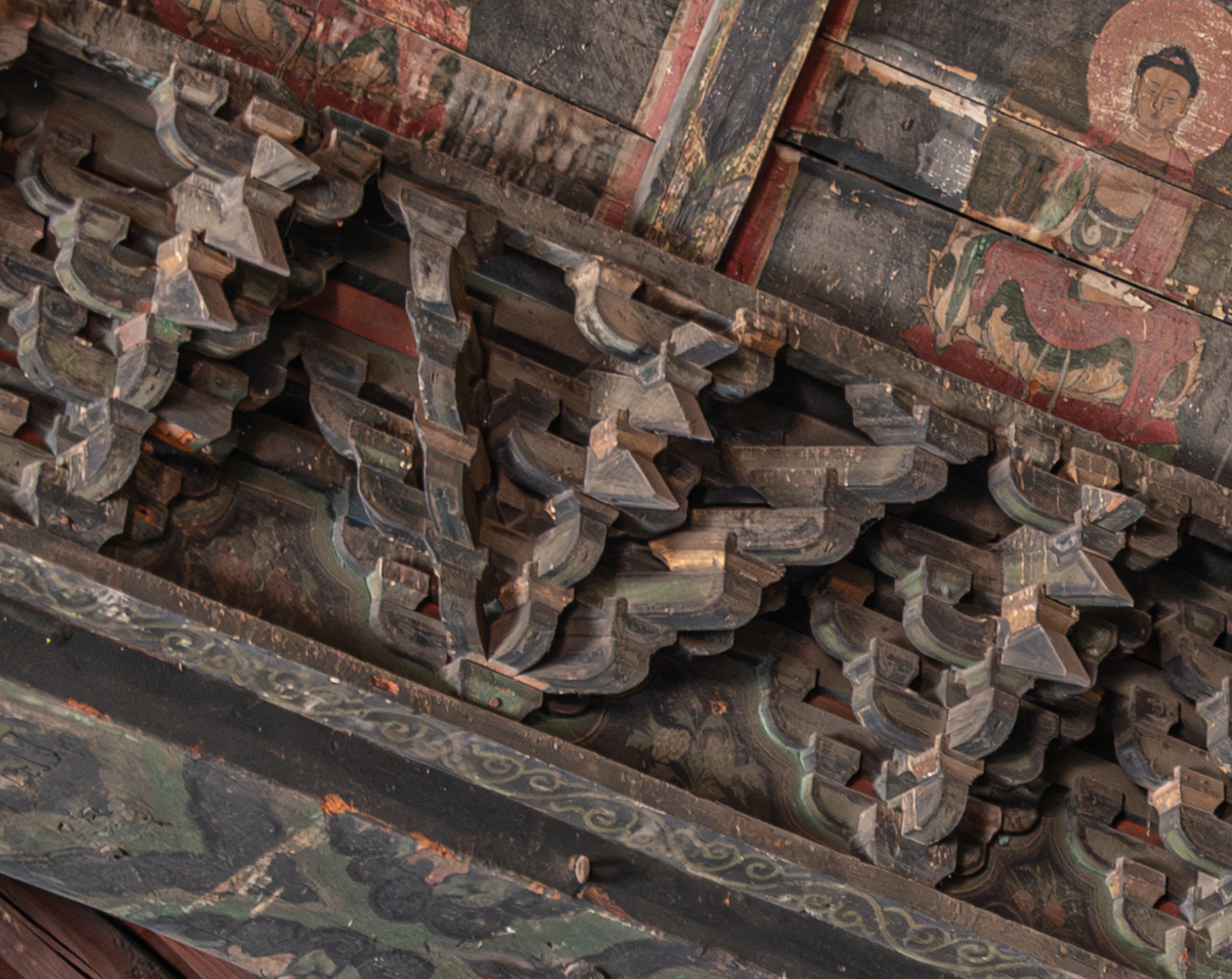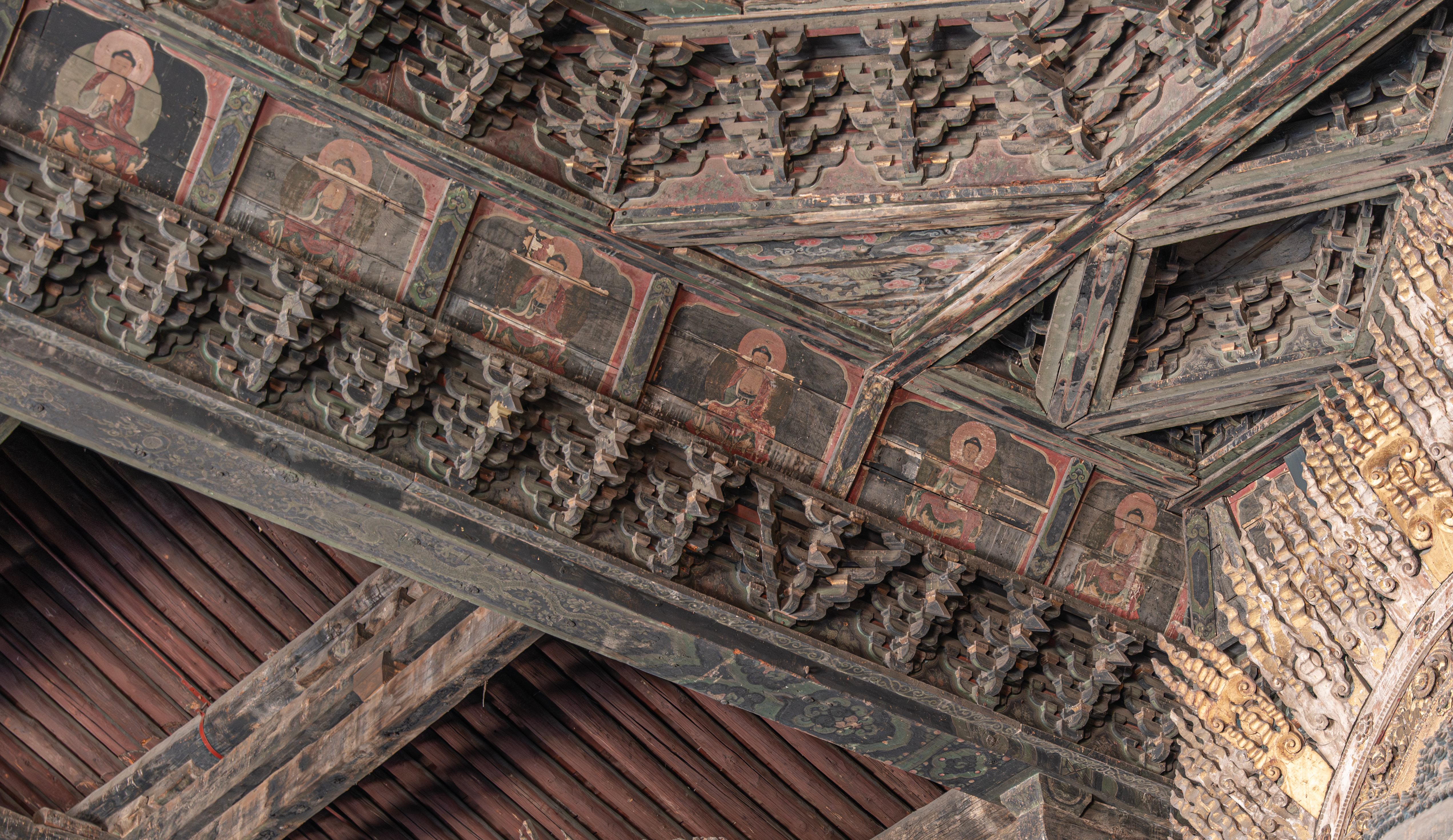 辽代斗栱小斗不归平的案例。善化寺大殿为辽代中期左右的建筑,其心间小木作藻井也被认为是辽代原物,小木作藻井斗栱与薄伽教藏壁藏一样,也属于忠实仿大木建筑的小木模型,一般唐辽建筑七铺作,重昂均会小斗归平,如东大殿、独乐寺观音阁上檐、薄伽教藏壁藏斗栱,但善化寺这组从斜栱高度对比来看,其小斗并未归平,有一个替木的高度落差,打破了对唐辽重昂建筑的固有印象。