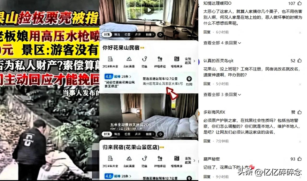 家人们,谁懂啊! 2025年10月2日,江苏连云港连云山花果山景区发生一起不愉快的事件,一名女游客在捡拾地上空板栗壳时,被民宿老板娘辱骂并用高压水枪喷射,随后民宿老板娘和女游客在警方的调解下,将民宿老板娘辱骂和喷射的行为赔偿300元了事,此事就这样结束了。 事件发生后,引起了网友的热议,有网友说:“民宿老板娘这么大火气,是不是没吃板栗啊? ”也有网友说:“300元一个的板栗壳。 ”还有网友说:“连云港要做大做强旅游产业,就不能让游客有这样的遭遇。 ”连云港文旅部门,鼓励游客捡拾地上空板栗壳,让游客快乐,让游客有个美好的回忆,没想到的是,这位女游客捡拾空板栗壳遭到了民宿老板娘喷高压水枪的攻击,回忆变成了阴影。 连云港文旅部门,鼓励游客捡拾地上空板栗壳,却不承担民宿老板娘喷高压水枪攻击游客的责任,推卸责任,让事件变成舆论危机,不知连云港文旅部门心里是什么滋味? 网友对民宿管理和景区责任不清的表示愤怒,说多了不值,旅游市场管理,存在严重的管理漏洞。 各位读者你们怎么看?欢迎在评论区讨论