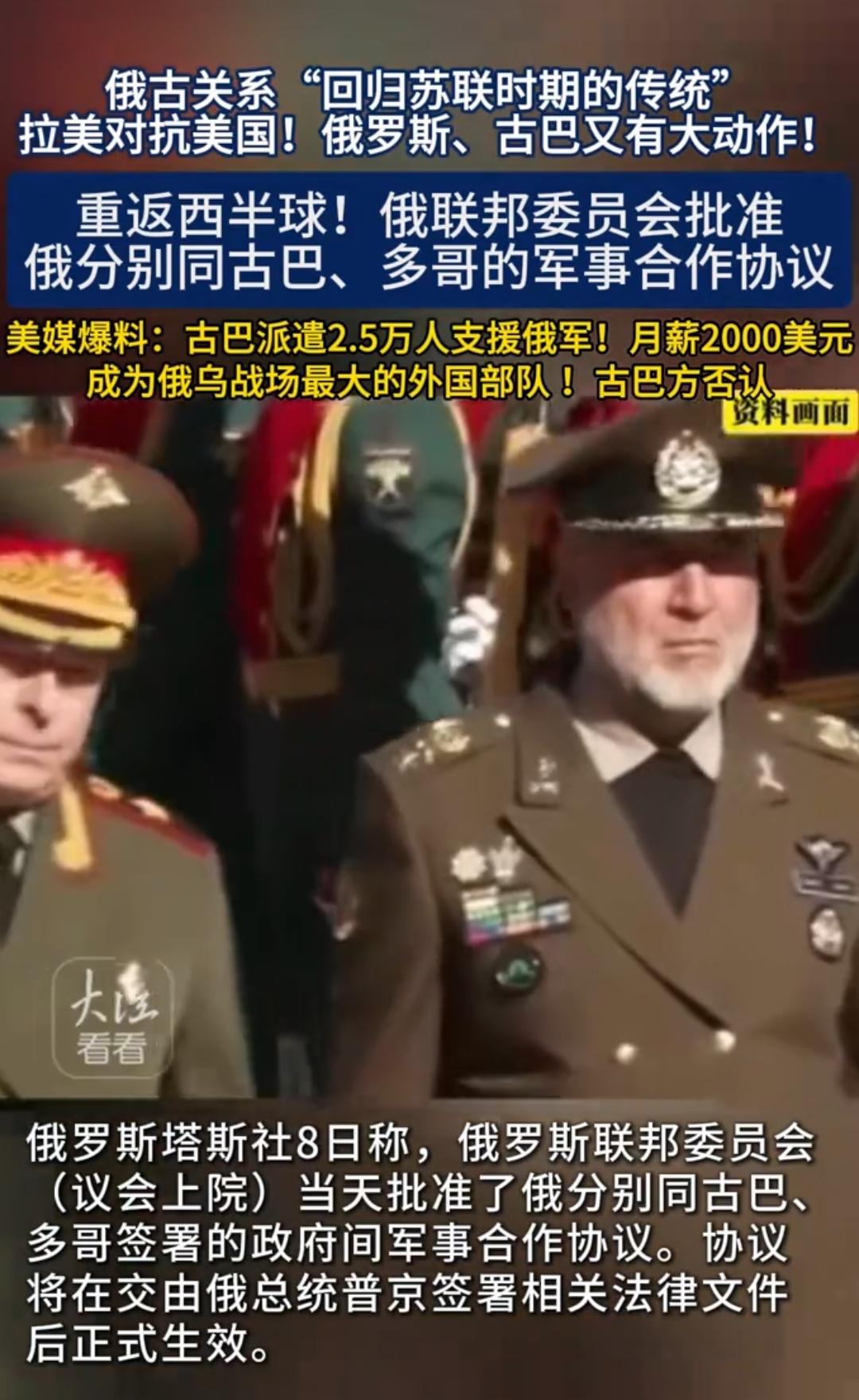俄罗斯把导弹放在古巴,可以攻击美国任何一个地方。美国这次会作出什么样的选择? 5000名古巴士兵援俄意味着什么?北约国家可是没有明目张胆地下场,都是给钱给武器,但是不给人。俄罗斯这边不一样,朝鲜上了,古巴也上了。委内瑞拉上不上不好说,但是阵营已经划分好了。 而且,这一次俄罗斯把导弹再一次放在了古巴瞄准美国,63年前肯尼迪用核大战吓退了赫鲁晓夫。这次呢?神经错乱的税宗能不能让普大帝再学习玉米大帝?我觉得很难。 上一次是两个上升的帝国之间的碰撞💥,这一次是两个衰落的帝国之间的碰撞。 俄罗斯已经做好打群架的准备了,北约还在继续算计。 点右上角关注我,我们一起去看这个魔幻的世界
