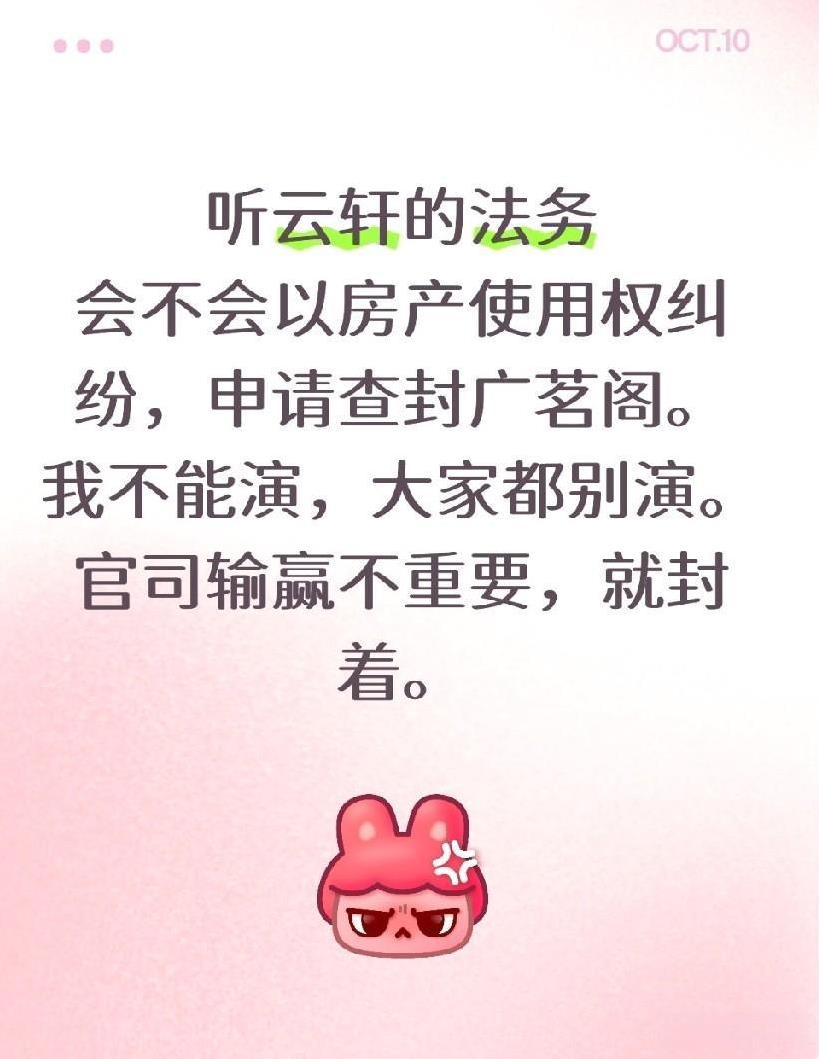听云轩法务,会不会以房产使用权纠纷,申请先查封广茗阁茶楼。 就是,我不能演出,大家就都别演出,官司输赢不重要,先让广茗阁封着,的心理。 毕竟,听云轩手里也有三年使用权的合同。 重点是,大房东说,没有和听云轩签过合同,如果二房东和大房东也没有租赁合同的话,(个人觉得,二房东没租房合同,就是口头协议,不然8号去了那多人,连锁都没开,证明拿不出什么书面材料)那就是听云轩和二房东的事了,和人家广茗阁的房产也没关系,那房产使用权的纠纷就不成立。 不知道赵立同心里慌不慌,反正我个人觉得,赵立同想开门营业,没那么容易。#广茗阁# #广茗阁茶楼# #听云轩广茗阁茶楼# #听云轩法务#