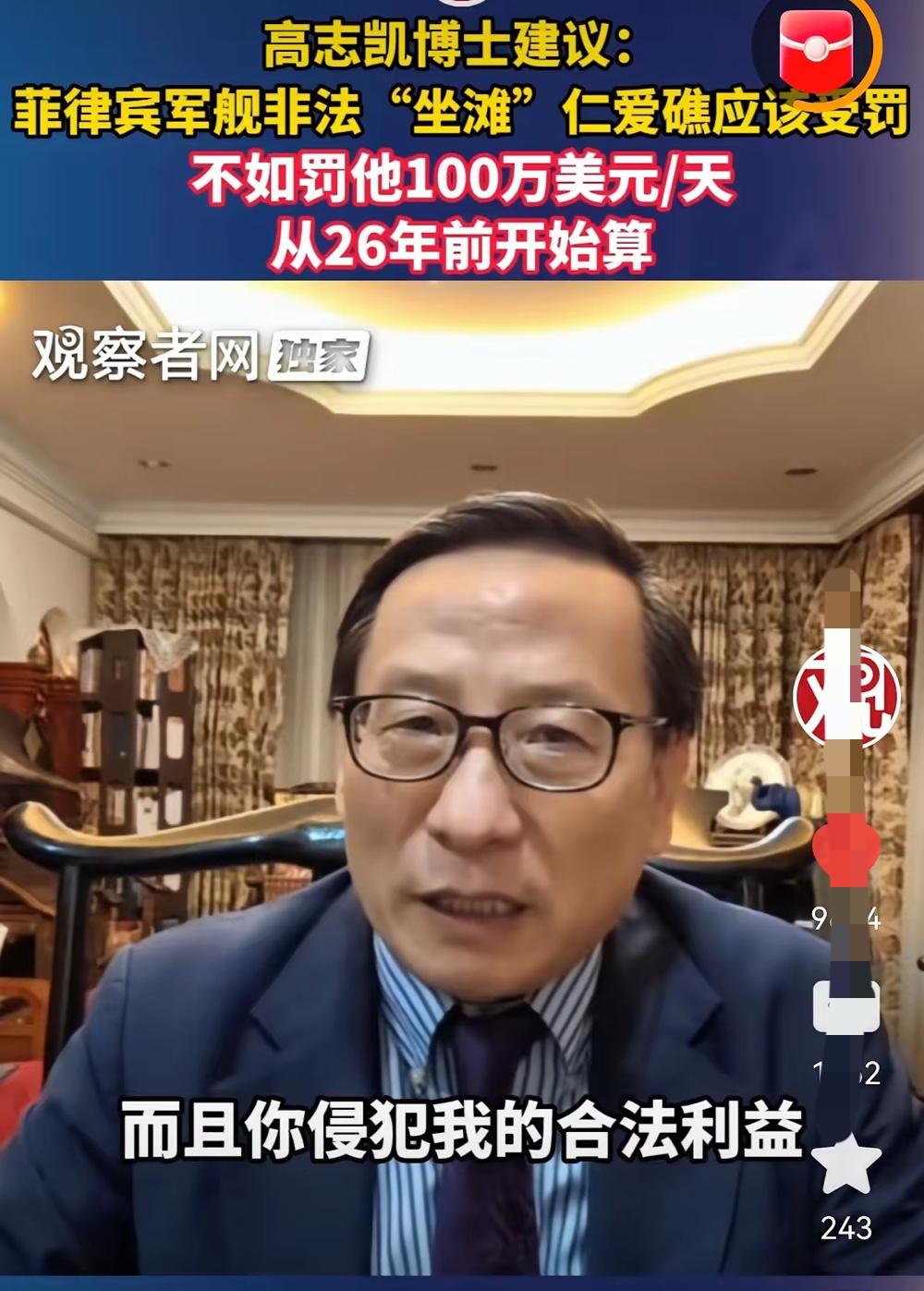 这个主意太绝了!罚款菲律宾坐滩船只100万美元/天! ​就在刚刚,著名学者高志凯教授建议:中国应该对菲律宾坐滩仁爱礁船只罚款100万美元每天,不是从今天开始,而从26年前算起。 ​有网友帮忙算了一下,从26年前菲律宾破船坐滩仁爱礁那一天开始算罚款,截止到今日,100×365×26=949000(万)。近95亿美金。不算滞纳金。人民币结算的话,可以优惠一点,大概665亿人民币。 谁能觉得这是“随口喊价”?高教授这建议,藏的全是法理和策略的门道!先不说95亿美金的数,单说“从26年前算”这一点,就精准戳中了菲律宾的“痛处”——那艘叫“马德雷山号”的登陆舰,1999年可不是真“搁浅”,是菲律宾故意开去仁爱礁浅滩,谎称“机械故障”,一占就是26年。这期间中国多次善意提醒,甚至允许菲律宾给船上士兵送基本物资,可他们倒好,偷偷运钢筋水泥加固船身,把废铁当成“主权标记”,这本身就违反了《联合国海洋法公约》里“未经主权国允许,不得在其管辖海域非法滞留”的条款,罚款从那天算,完全站得住脚。 再说100万美元/天的标准,真不算多。仁爱礁周边海域,光是渔业资源每年就能给中国渔民带来数亿收入,可因为菲律宾这艘破船占着,部分海域没法正常作业;更别说海底可能存在的油气资源,开发计划也受影响。这些隐性损失加起来,每天100万都不够赔。之前越南在南海非法搭建钻井平台,中国也是按“侵权日薪”算过账,最后越南乖乖撤走——不是要真拿多少钱,是用这种方式告诉对方:占着别人的地盘,就得付出代价,别想“白嫖”主权。 网友算的665亿人民币,看着吓人,其实是给菲律宾留了台阶。高教授特意提“人民币结算可优惠”,不是真要纠结货币种类,是暗示“只要你撤走船,这事有的谈”。菲律宾心里门儿清,他们每年从中国赚多少好处?2024年菲中贸易顺差超300亿人民币,香蕉、菠萝有70%靠出口中国,要是真闹到“扣贸易款抵罚款”,他们先扛不住。之前菲律宾农业部还哭着求中国别减少水果进口,现在面对665亿的“账单”,再硬撑下去,损失的可不止一艘破船。 更妙的是,这建议把“理”牢牢握在手里。国际上总有人抹黑中国“强硬”,可这次是按规则来——先有菲律宾非法坐滩,后有中国依法索赔,每一步都有国际法和历史事实撑腰。菲律宾要是敢喊“不公平”,就得先解释:为啥1999年要故意把船开去仁爱礁?为啥每年偷偷加固不撤走?这些问题他们根本答不上来,只能打哑巴仗。高教授这招,就是用“合法索赔”的方式,让国际社会看清谁才是“规则破坏者”。 有人说“菲律宾不会真给钱”,可这建议的重点本就不是“收钱”。是要通过这事儿让菲律宾明白:中国对仁爱礁的主权,不是嘴上说说,是能算出“成本”的;26年的容忍不是软弱,是时候让他们知道“占礁有代价”了。之前菲律宾在美国撺掇下,派船闯仁爱礁、联合军演秀肌肉,现在用“罚款”回应,既没激化冲突,又亮明了底线,比单纯的口头抗议管用多了。 说到底,这665亿人民币的“账单”,是给菲律宾的一道选择题:要么撤走破船,恢复仁爱礁的平静;要么继续硬撑,看着代价越来越大。中国一直愿意对话,但前提是菲律宾得尊重中国主权,别抱着“占着就是我的”的幻想。高教授这建议,既狠又准,把道理和策略揉在一起,让菲律宾想赖都赖不掉。各位读者你们怎么看?欢迎在评论区讨论。