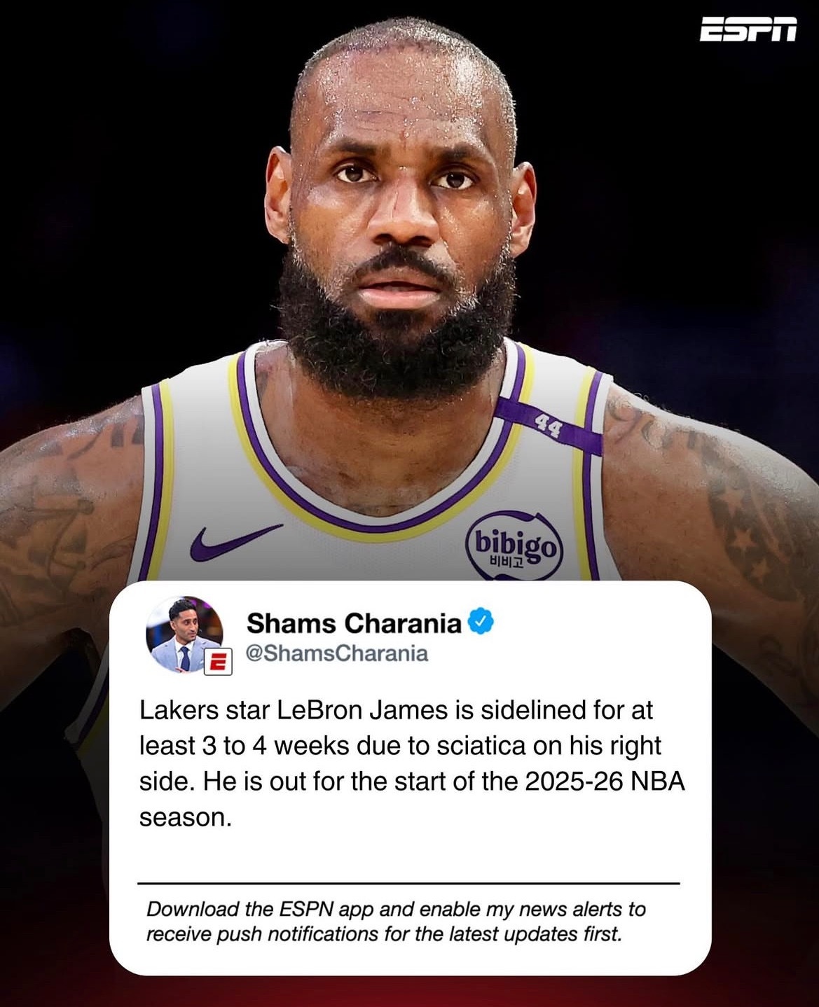 Shams:詹姆斯因右侧坐骨神经痛,将至少缺阵3至4周,他将无法参加2025-26赛季NBA的揭幕阶段比赛。
