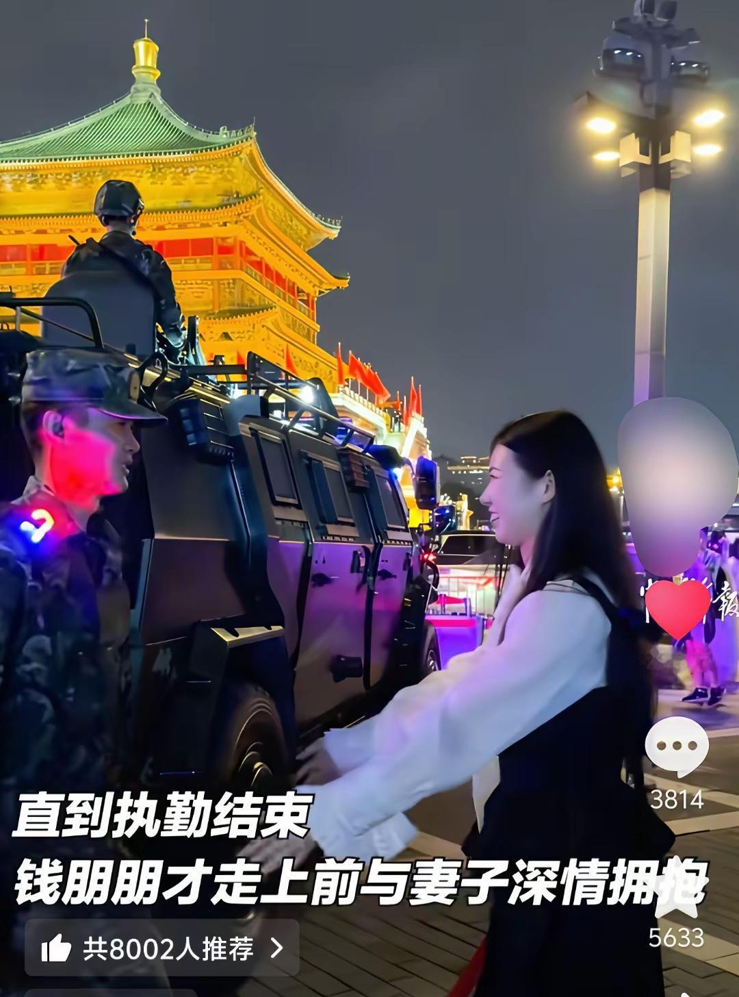 安徽,妻子得知丈夫国庆不回家,就坐车去西安看他。谁料,丈夫看到妻子,只是看了一下,扭头一句话都没说!原来,她的丈夫是一名军人,得知丈夫国庆在西安执勤,就从安徽坐车,奔波八百里来到西安。只为给丈夫一个惊喜。网友:“你守着岗位,我守护你。” ​​视频里,妻子潘红穿着黑色的连衣裙,满脸笑容的出现在,正在执勤的丈夫钱朋朋面前。他一下子愣住了,眼神里写满不可置信,随后立即又恢复了板板正正的执勤状态。 ​​直到执勤结束,钱朋朋快步冲向妻子,一把将她拥入怀中。 谁能想到,潘红为了这趟“惊喜”,前一天晚上几乎没合眼。她从安徽宿州的小县城出发,先坐两个小时大巴到徐州,再转高铁到西安,全程折腾了近十个小时。背包里装着的不只是换洗衣物,还有她特意给丈夫做的酱鸭——钱朋朋最爱吃这个,她怕路上坏了,特意用三层保温盒装着,一路都揣在腿边护着,连高铁上的热水都没敢多喝,就怕起身碰翻了。 钱朋朋不是不想回家,是真的走不开。他所在的部队负责西安大雁塔景区的国庆执勤,每天要从早上八点站到晚上十点,疏导游客、维持秩序,连喝口水都得找间隙。这已经是他在部队的第八年,八年里,他只回过三次家,错过的节日能排满一张纸:结婚纪念日他在野外驻训,女儿出生时他在执行演习任务,就连去年父亲住院,他也只赶回去陪了三天就归队。每次视频,他总说“等任务结束就回家”,可“任务结束”的日子,总在一次次紧急集合里往后推。 潘红其实早就习惯了这样的日子。家里的农活、照顾老人和五岁的女儿,她一个人扛了下来。这次决定去西安,也是因为女儿前几天睡前哭着问“爸爸什么时候回来陪我看烟花”,她才想着,就算自己跑一趟,也要把家里的牵挂带给丈夫。出发前,女儿还特意画了张画,让妈妈交给爸爸,画上是歪歪扭扭的一家三口,旁边写着“爸爸加油”。 视频里钱朋朋“扭头不说话”的样子,看着冷,其实藏着军人的无奈。他后来在采访里说,看到妻子的那一刻,脑子都懵了,第一反应是“她怎么来了”,紧接着就想到自己还在执勤,不能分心——身边是摩肩接踵的游客,身后是需要守护的秩序,他哪怕多跟妻子说一句话,都可能忽略潜在的安全隐患。所以他只能硬着头皮转过头,把那句“你怎么这么傻”咽回肚子里,直到下岗的哨声响起,才敢撒开腿往妻子身边跑。 拥抱的时候,潘红能感觉到丈夫肩膀上的汗渍,还有他手臂上因为常年训练留下的茧子。钱朋朋把脸埋在她的肩膀上,声音有点哑:“让你跑这么远,委屈你了。”潘红笑着拍他的背:“看到你好好的,比啥都强。”旁边的战友们早就悄悄围了过来,有人递上矿泉水,有人拿着手机记录下这一幕,还有人打趣说“钱班长,嫂子来了,今晚得请我们吃喜糖啊”,原本严肃的执勤点,瞬间被暖意裹住。 网友说“你守着岗位,我守护你”,这话不是空话。钱朋朋守着的,是千万游客的平安团圆;潘红守护的,是这个小家的温暖牵挂。像他们这样的军人家庭还有很多,丈夫在边疆站岗、在海岛巡逻、在城市执勤,妻子在家里撑起一片天,把思念藏在每一次视频通话、每一趟千里奔赴里。他们的惊喜,没有鲜花和烛光晚餐,却有着最朴素的理解和最坚定的支持——你护大家,我守小家,这就是最动人的家国情怀。各位读者你们怎么看?欢迎在评论区讨论。