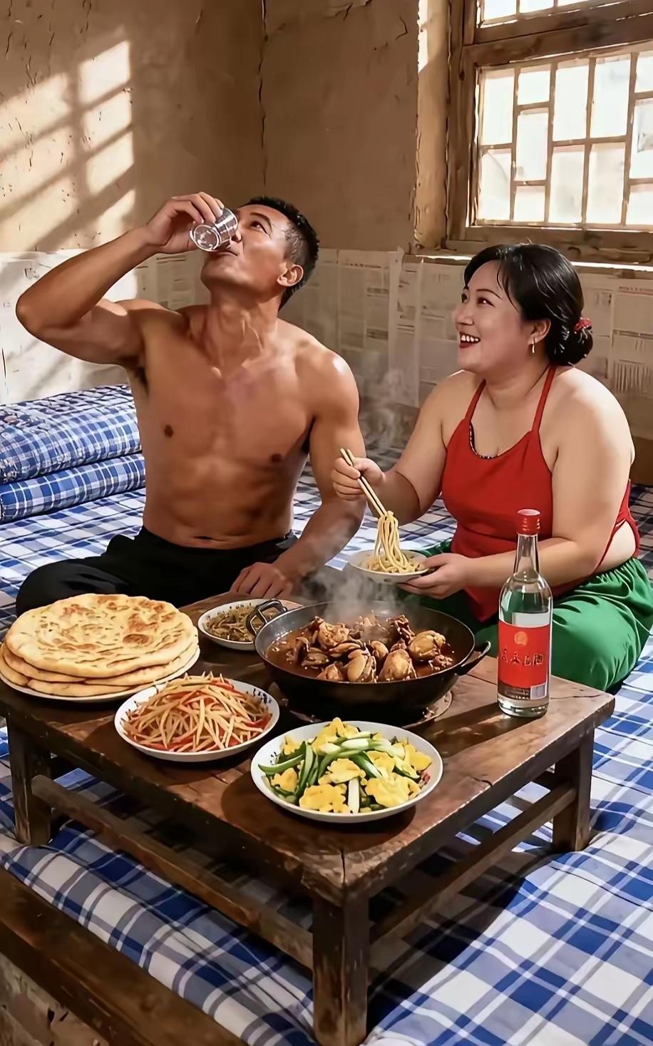 《土窑情味》 土窑光影落格窗, 壮汉豪饮酒一觞。 红袄佳人拈面笑, 家常小菜暖心肠。 饼香肉嫩盘盘满, 烟火寻常滋味长。 不必朱门珍馐宴, 此中情韵最难忘。农家一碗烟火气 乡土味故乡情 乡土灶韵 柴房老味