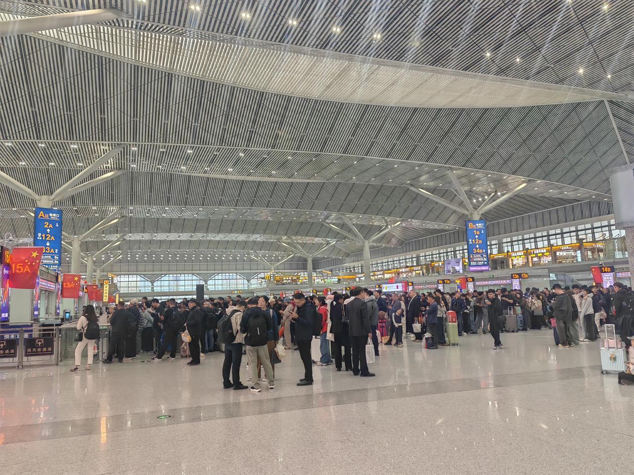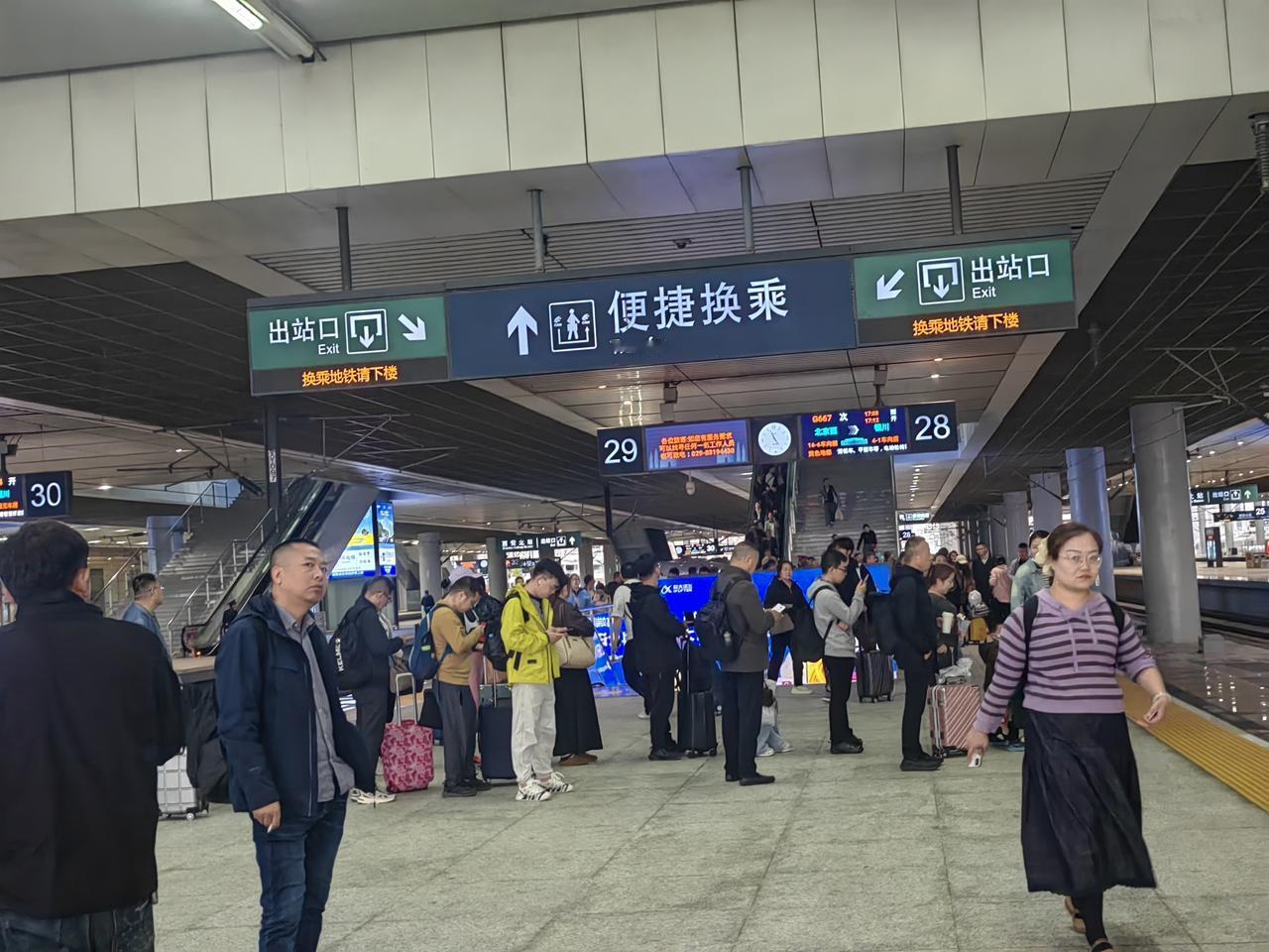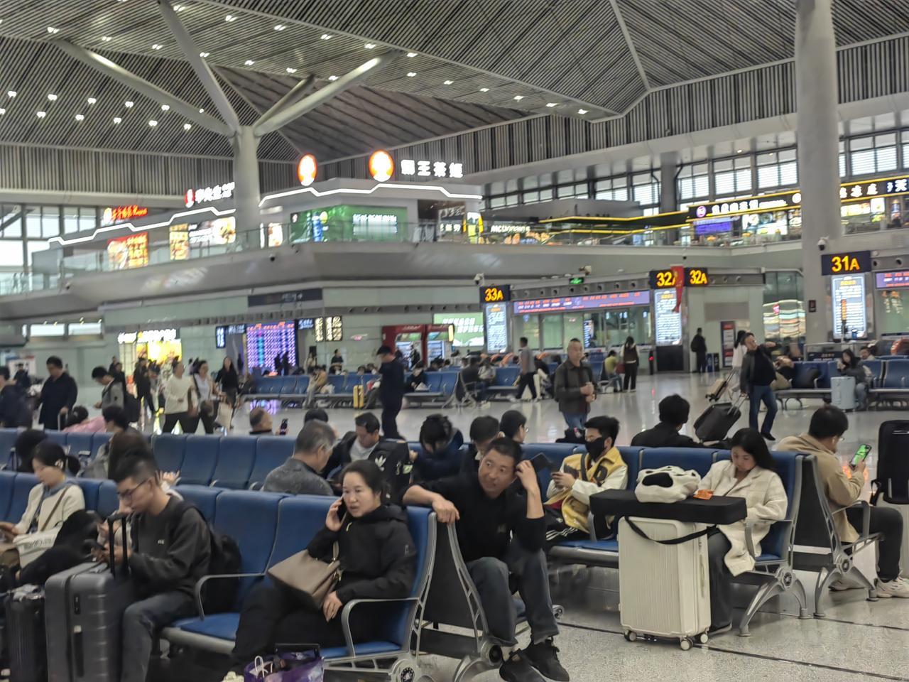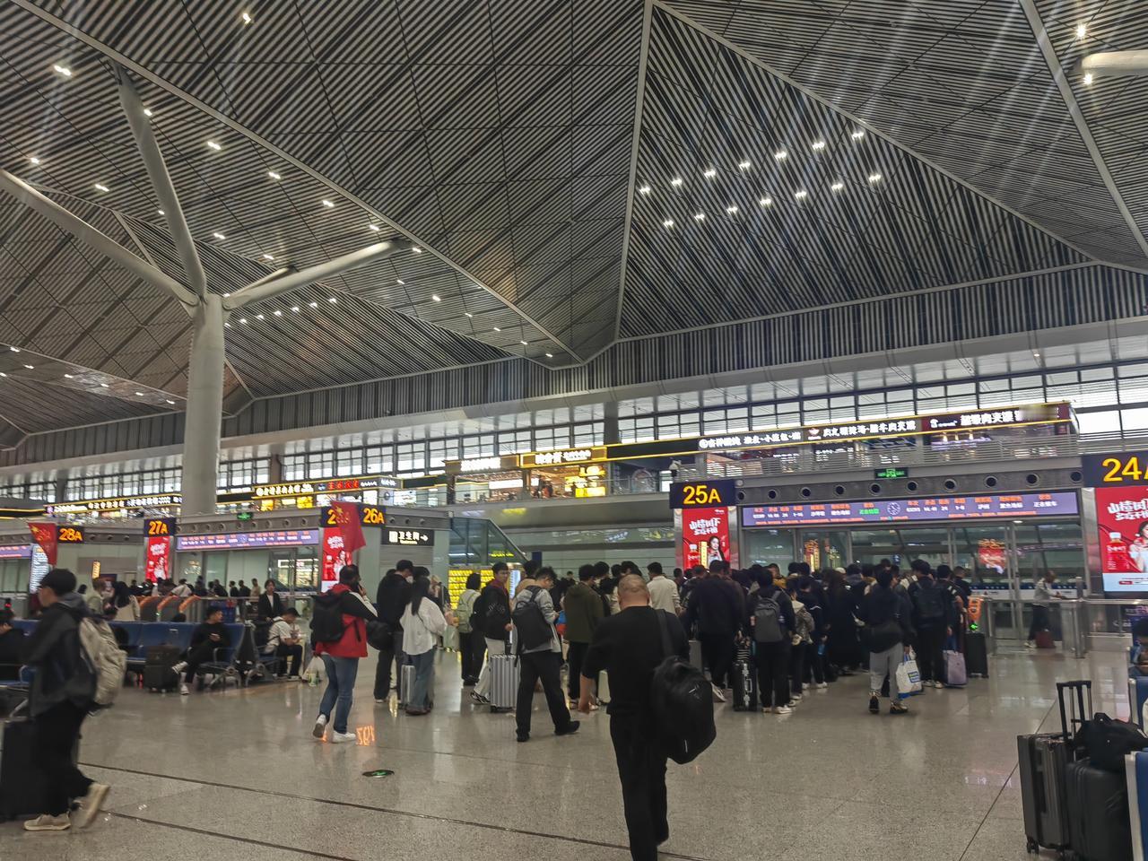 2025年10月9日下午五时,西安北站仍然挤满了返程旅客。从高铁时刻表看,好多人