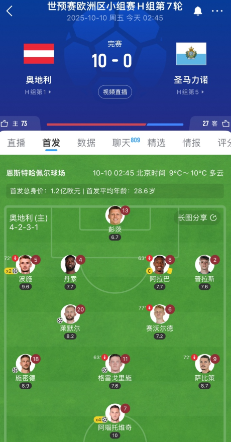 世预赛欧洲区小组赛H组第7轮,奥地利10-0大胜圣马力诺,本场比赛奥地利首发11