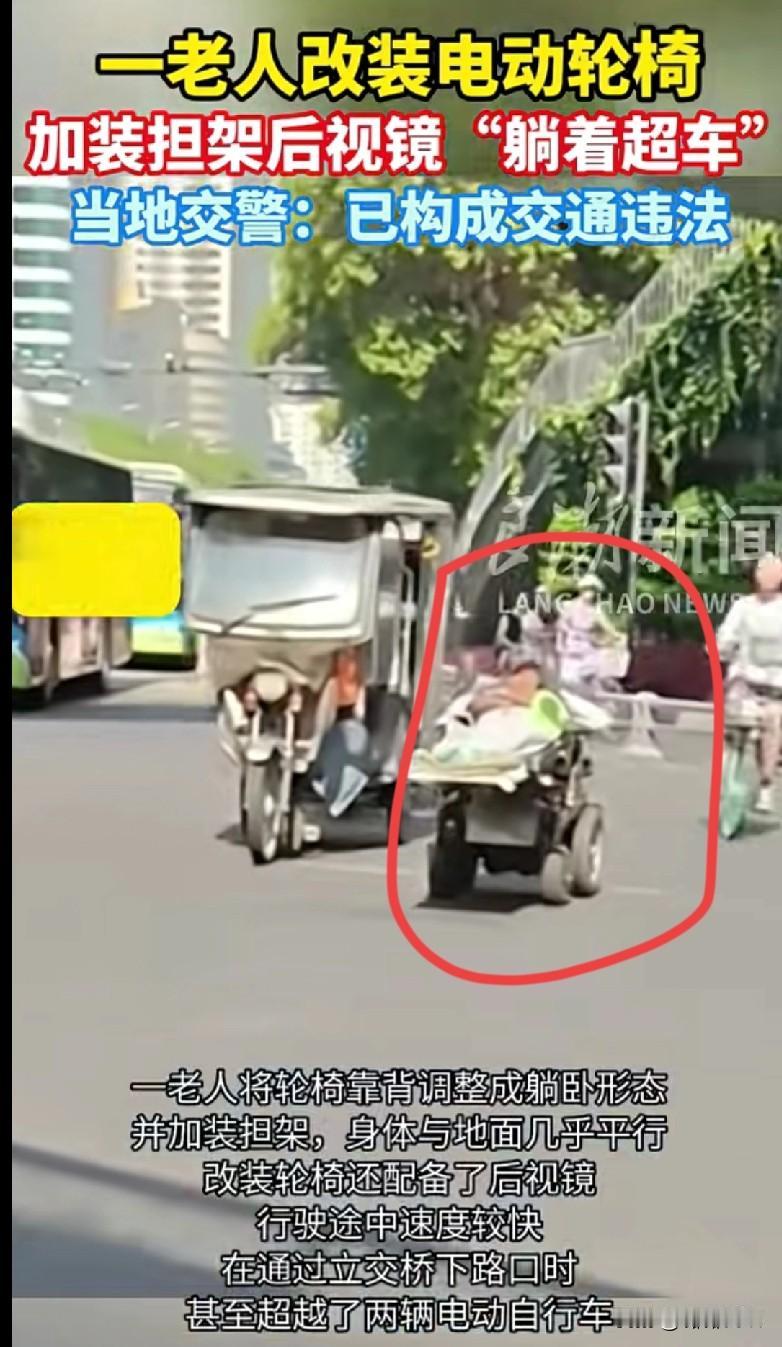 家人们快来看这“硬核”大爷!把电动轮椅改成“躺平赛车”,加装担架、后视镜,直接躺着在路上超车,连电动车都被他甩在后面! 咱就说,这操作也太秀了!大爷把轮椅靠背调成躺卧,身体几乎贴地,还整了后视镜,行驶速度快得很。在立交桥下路口,居然超了两辆电动自行车,这“躺平超车”的画风,简直绝了! 不过交警说了,这已经构成交通违法了。咱可得提醒一句,改装虽“酷”,但安全更重要啊!这种操作太危险,可不能学。最后还是希望大爷能重视安全,咱可别为了“拉风”把自己置于险境哦~