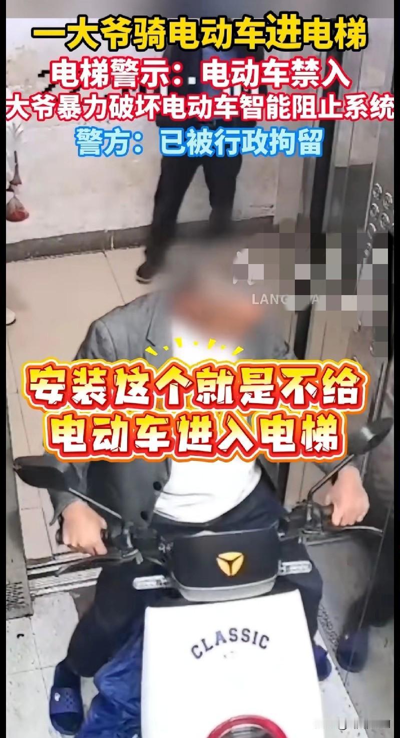 家人们快看这操作!一大爷骑电动车硬闯电梯,电梯都明确警示“电动车禁入”了,他倒好,直接暴力破坏智能阻止系统! 咱就说,电动车进电梯多危险啊,着火了那可是要命的事!这大爷倒挺“勇”,为了把车弄进电梯,对安全装置又砸又撬。结果呢?直接被警方行政拘留了! 真不是咱多管闲事,这安全规则可不是闹着玩的。别为了图一时方便,把自己和邻居的命都搭进去。咱可得长点心,遵守规则既是保护自己,也是保护别人啊!