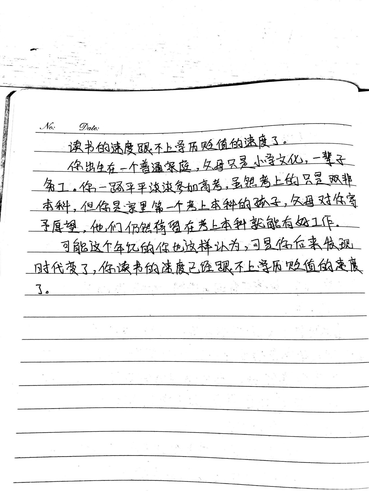 读书的速度跟不上学历贬值的速度了 你出生在一个普通家庭,父母只是小学文化,一辈子务工。你一路平平淡淡参加高考,虽然考上的只是双非本科,但你是家里第一个考上本科的孩子,父母对你寄予厚望,他们仍然停留在考上本科就能有好工作。 可能这个年纪的你也这样认为,可是你后来发现时代变了,你读书的速度已经跟不上学历贬值的速度了。