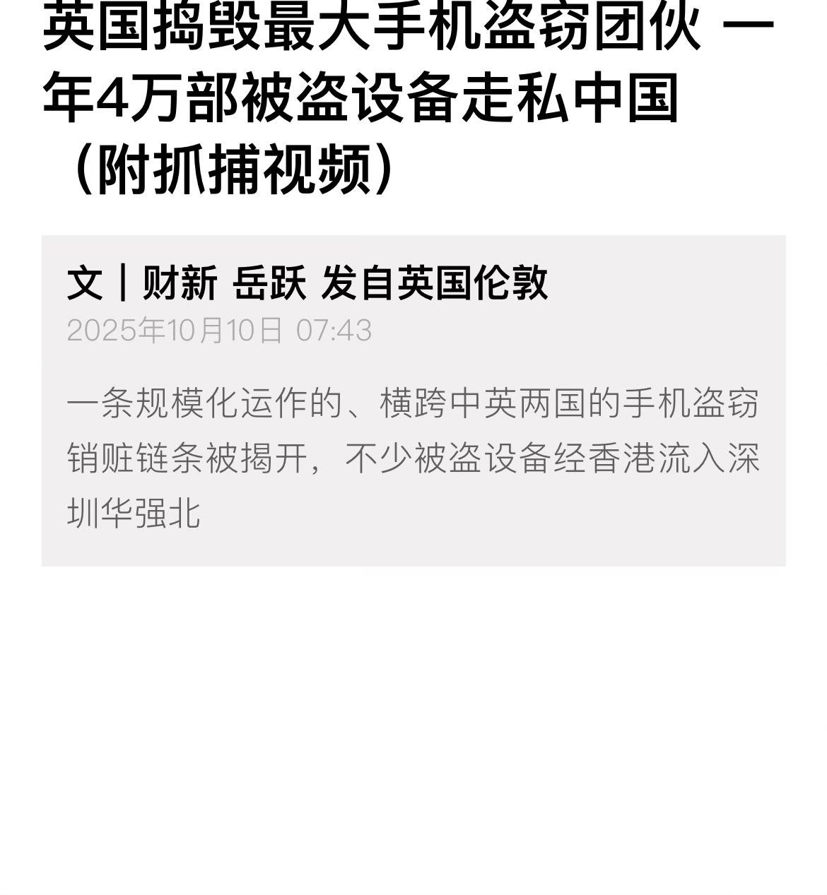 比贩毒还赚?英国盗贼弃毒改偷手机,已逮捕46人、查获近四万部走私至中国的手机”,FT调查显示,被盗设备通常先在香港观塘的工业大厦内中转,以在线拍卖的方式卖给主要来自深圳的买家,最终流入深圳华强北地区,尤其是飞扬时代大厦。设备被拆解成屏幕、电路板、芯片等零件销售。
