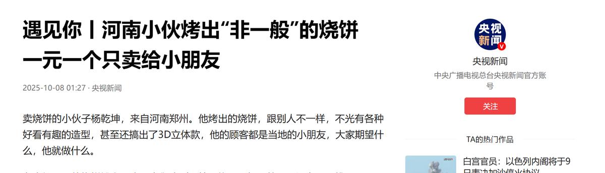 “活该他发财!”2025年10月,河南郑州,一男子烤出各种有趣造型的烧饼,有飞机、航母、三星堆面具等形状,小朋友喜欢什么就烤什么,售价一个一元,顾客几乎天天排长队,网友:这也太有才了! 你要是下午放学去郑州那所小学门口瞅一眼,准能看见个特热闹的烧饼摊,不是因为香味儿飘得远,是那摊上的烧饼长得太不一样了! 有歼 - 35 战机那样的,翅膀尖尖翘着,有航母造型的,连甲板上的纹路都隐约能看着,还有三星堆面具的,圆乎乎的轮廓特传神。 围着摊儿的全是小朋友,叽叽喳喳地报自己想要的造型,队伍能排出去好远,这场景谁看了都得说一句:“这摊主也太会了!” 摊主人叫杨乾坤,27 岁,你肯定想不到,他还是个土木工程硕士,放着大家眼里 “体面” 的工作不干,来小学门口烤烧饼,一开始还有人质疑 “研究生卖烧饼,是不是白读书了”,可看完他做烧饼的劲儿,再看看孩子们那股喜欢劲儿,没人再这么说了,反而全是 “活该他发财!” 的声音。 他做烧饼跟别人真不一样,不是随便捏两下就烤,毕竟是学工程的,他把工地上画图纸的劲儿都用在了面团上,想做个新造型,先在纸上画详尽的设计图,哪里该鼓一点,哪里该薄一点,比例怎么调才像,都标得清清楚楚。 他自己说面团这东西软乎乎的,想复刻所有细节不现实,所以就把心思放在轮廓和比例上,保证小朋友一眼就能认出来 “这是飞机!”“这是航母!”,这份较真儿,可不是随便烤烧饼的人能做到的。 刚开始做的时候,也不是一帆风顺,有时候捏好的 “枪托”,进烤箱前还好好的,烤着烤着就断了,有时候造型捏得挺像,火候没掌握好又烤糊了。 换别人可能早烦了,可杨乾坤不,他跟解决工程难题似的,断了就立刻返工重做,烤糊了就记下来这次的火候,下次调整,就这么反复试,慢慢摸透了面团的 “脾气”,后来做出来的烧饼,不光造型像,口感也不差外脆里软,小朋友吃得香家长也放心。 他还特懂小朋友的心思,摊儿旁边放了块小黑板,小朋友想要什么造型,比如今天想看奥特曼,明天想要小火车,都能自己写在黑板上。 杨乾坤看到了,就会试着做出来,本来是小朋友被动买烧饼,这下成了能参与创意的 “小设计师”,孩子们的热情更高了,今天写了心愿,明天放学就早早来等,盼着自己想要的造型能出现在摊上。 这种小仪式感,让孩子们觉得这烧饼是 “专属” 的,拿到手都舍不得立刻吃,先跟同学显摆一圈,“你看,这是我昨天在黑板上写的航母!” 更让人觉得暖心的是,他的烧饼一直卖一块钱一个,不管造型多复杂,捏起来多费劲儿,从不涨价,而且只卖给小朋友。 有次他听说有群孤独症小朋友没法出门排队,特意做了一大波他们可能喜欢的简单造型,送过去给孩子们,那些孩子拿着烧饼,有的还会轻轻摸一摸上面的纹路,那一刻这烧饼就不只是吃的了,成了传递劲儿的小载体。 有时候递烧饼给小朋友,他还会随口说两句,比如递 “东风导弹” 造型的,就说 “这是咱们国家的厉害武器哦”,没刻意教什么,却把大国重器的小种子悄悄埋在了孩子们心里。 有人问他,生意这么好,为啥不扩大规模,搞产业化,多赚点钱?他说不想,他就想在小学门口,每天看着小朋友围着摊儿开心的样子,给他们做喜欢的烧饼,这种快乐比赚再多钱都实在,他还说 “少内耗、多做事”,别人怎么质疑都不管,就专注把眼前的烧饼做好。 你说这样的人,能不招人喜欢吗?懂专业,肯较真,还心细又善良,把一块钱的烧饼做成了小朋友的快乐,做成了有温度的事儿。 (信息来源:央视新闻——遇见你丨河南小伙烤出“非一般”的烧饼 一元一个只卖给小朋友)