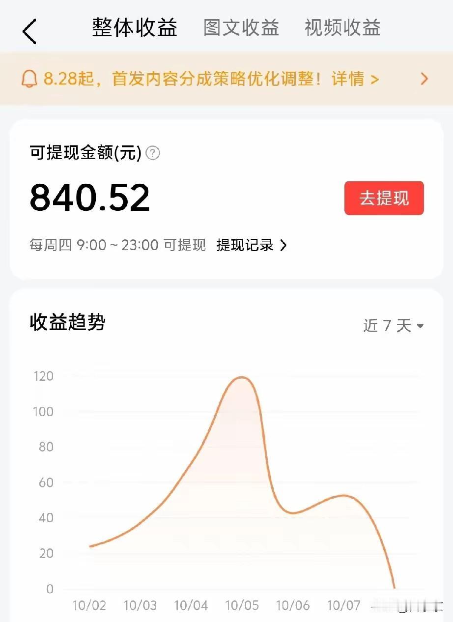 今天周四,头条发周薪啦!上班第一天就有钱拿,很开心! 十一前被禁言一周,错过上周四提现的时间,实际今天能提的是两周的钱! 一共840多,这两周平均一周400多,对于业余写作的我来说,很不错了! 因为国庆前被禁言一周,错过上周四提现。其实这两周平均也就400多,不算多。 但最近手头紧,能拿到已经不错。上周账号突然不能用了,吓得我赶紧把钱全提出去,以后再也不敢存着了。 以前总觉得平台规矩不会变,现在才明白啥都可能发生。禁言那周啥也干不了,只能干着急。 有朋友说这也正常,有些博主被封更久。我写写看看80后的难处,赚这点钱得小心翼翼。 现在每次发文章都得反复检查,生怕再说错话。 昨天问了好几个做自媒体的朋友,他们也有类似经历。 有人账号被封后申诉了半个月才解开,损失挺大。现在大家都不敢存太多在平台账户,能提就提。有人说这是多疑,但真遇到问题才知道着急。 这840块里,有写文章的,也有拍短视频的。其实每天也就抽空弄个把小时,主要还得上班。算下来每小时挣40多,比打工划算,但不稳定。上次有篇爆款挣了200,平时就几十块。有时候熬夜改稿,第二天还打不起精神上班。 有个做育儿号的朋友,之前被封一个月,靠之前的积蓄撑着。现在她同时在几个平台发内容,说不能把鸡蛋放一个篮子里。 我也在摸索别的办法,但这需要时间学习。最近试着做购物分享,但还没啥收益。 钱到账后直接充了孩子培训费。老婆说总算能补上上周的窟窿。现在看到平台消息就紧张,生怕又有变动。以前觉得赚钱容易,现在才懂,这行水太深。 能提多少是多少吧,别指望天上掉大饼。 平台规则总变,账号随时可能出问题。 别人说这是自由职业的好处,但真做起来到处是坑。这次提完钱,我把账户里剩下的都转出来了。 管它有没有风险,安全第一。以后少整那些敏感话题,平平安安拿点零花钱就行。
