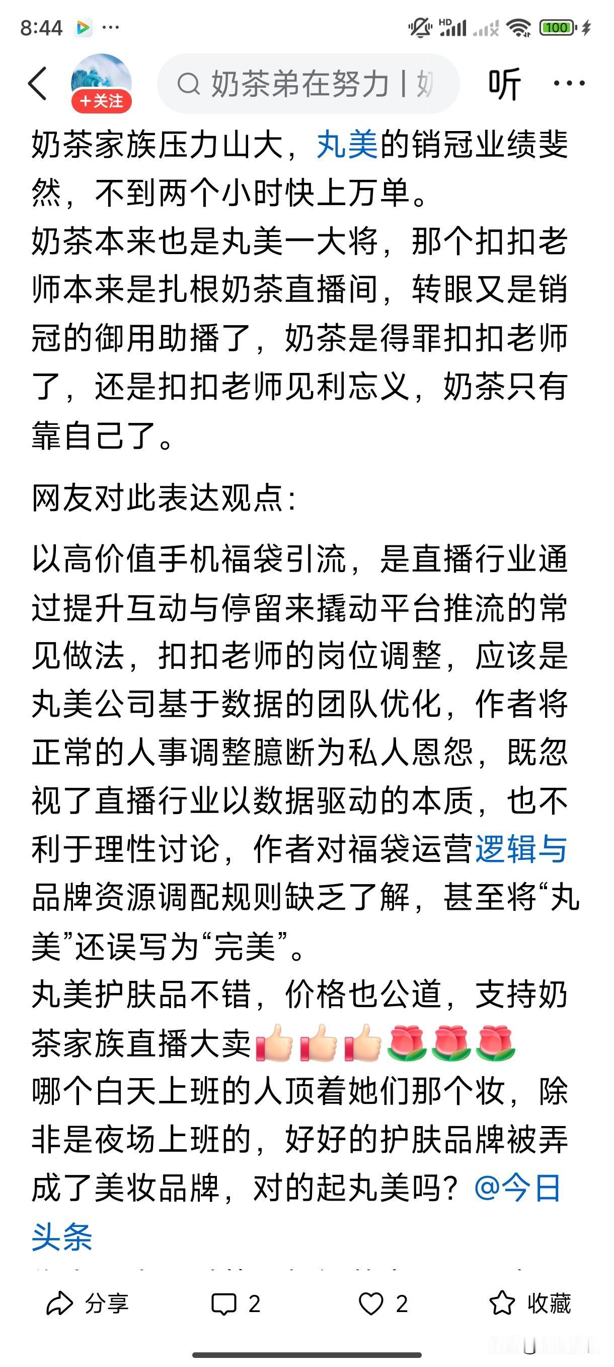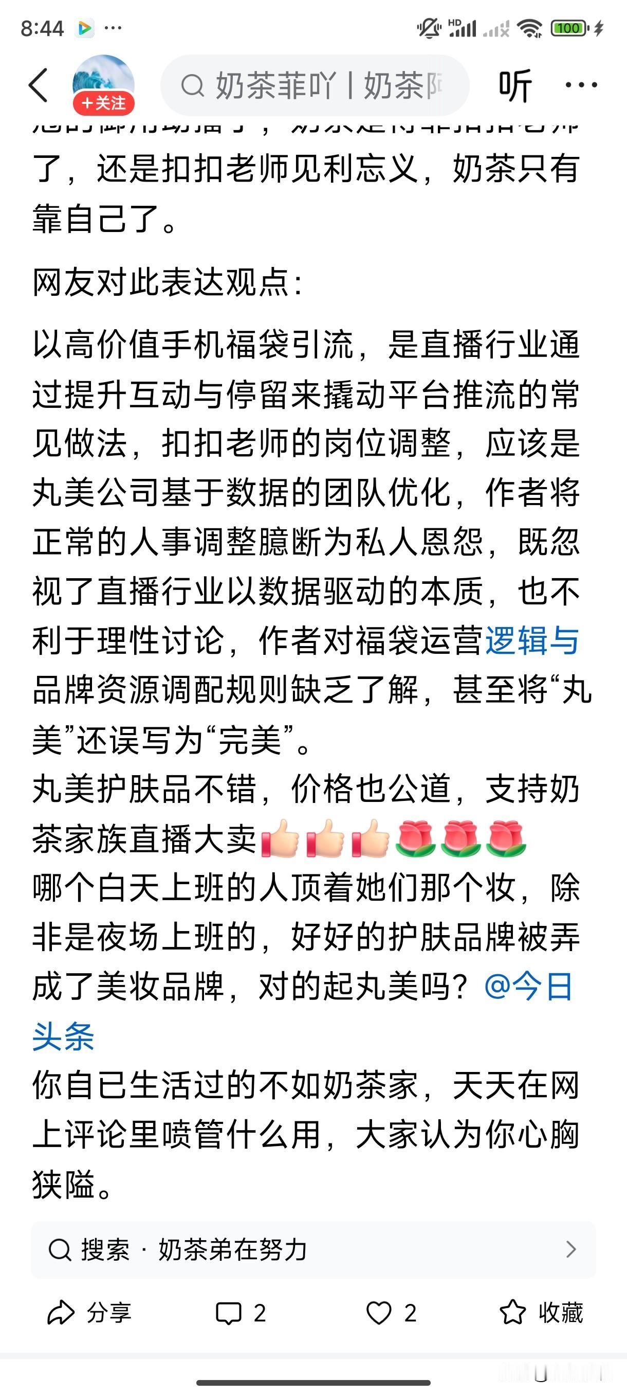 首先这位网友你有点爱屋及乌了,你喜欢奶茶她家族,那是你的事,不能因为这点就抨击其他人。 我先不说奶茶一家啥人品,就说这个带货的事,奶茶家销售业绩不如斐然,之前在奶茶直播间的扣扣老师去了斐然的直播间当助播有什么问题呢?你的意思是别人非得陪着她一块衰落?请问奶茶是不是也为了赚网民的米?要不然她会叫你们家人们?你试试让奶茶带着你一起赚米,看她愿意不?都是为了赚米,她不行,人家肯定要找好的,你的想法不是很可笑、很幼稚吗?说别人过得不如奶茶才去喷?那你又是为何又天天在网上叭叭叭维护奶茶?别人能不能说你是她家亲戚?或者又是她家小号?据说🎺多得很,否则说明你脑子出问题了。 明明是个胖大妈,硬是美颜滤镜把自己搞成了18岁,骗人的👻。