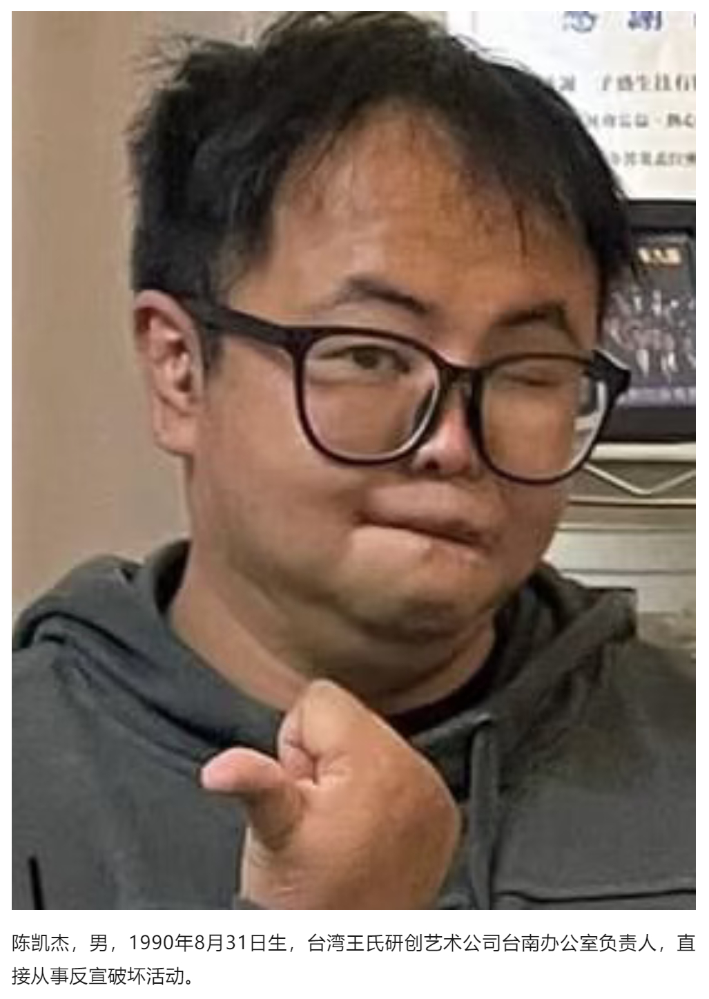 陈凯杰,男,1990年8月31日生,台湾王氏研创艺术公司台南办公室负责人,直接从事反宣破坏活动。