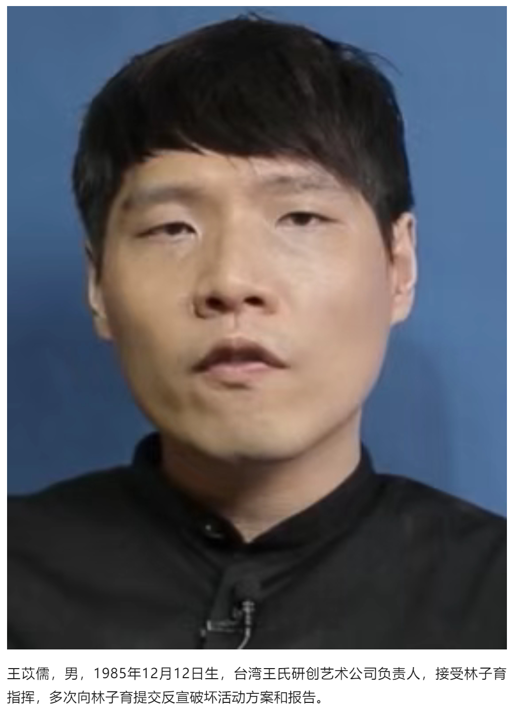 王苡儒,男,1985年12月12日生,台湾王氏研创艺术公司负责人,接受林子育指挥,多次向林子育提交反宣破坏活动方案和报告。