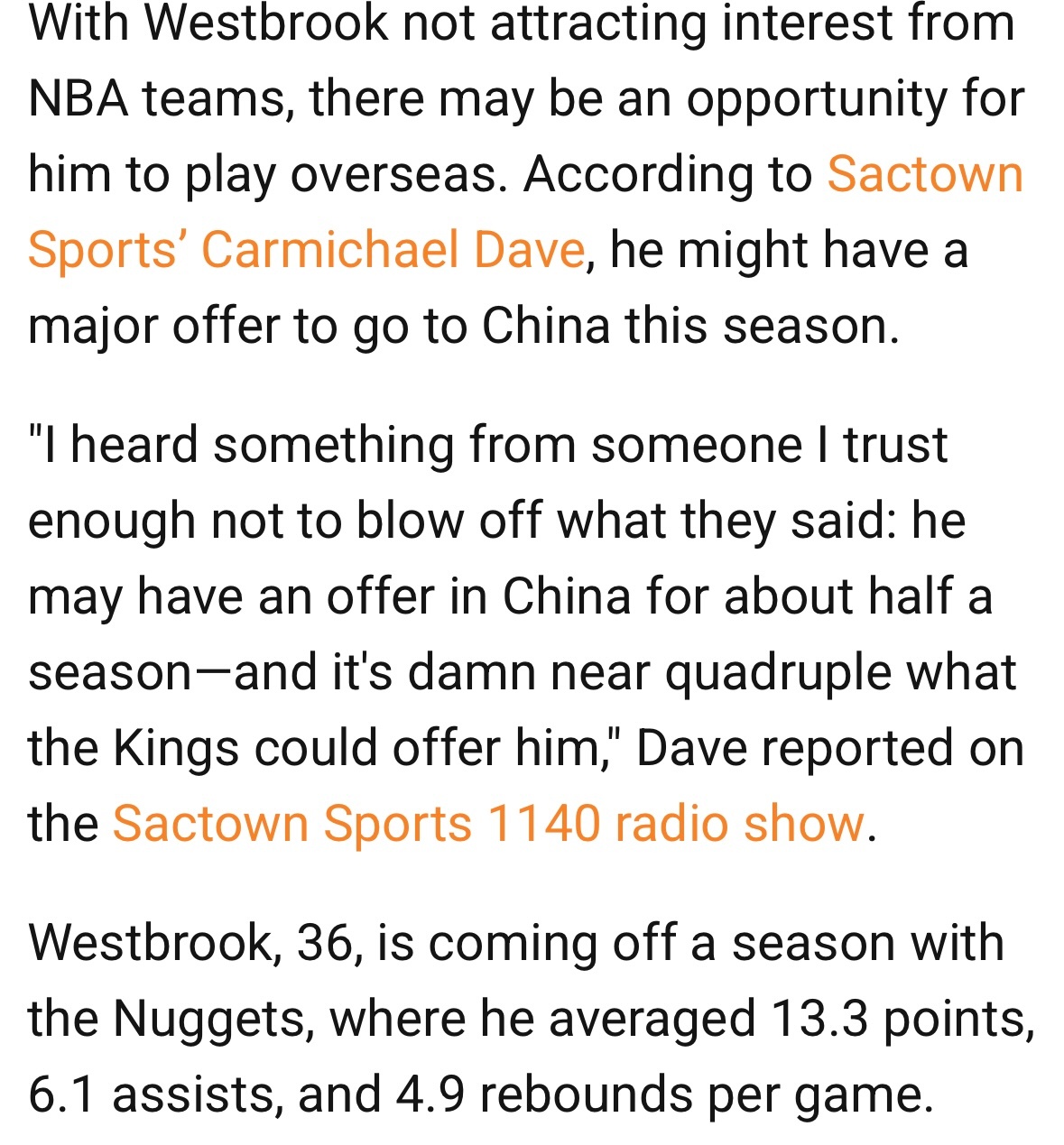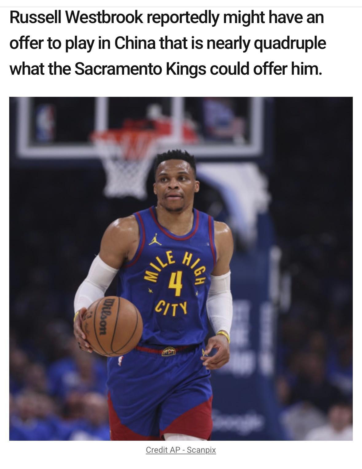 国王记者Carmichael Dave透露,威少可能收到了来自一份中国球队的报价。