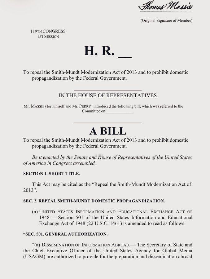 🚨🇺🇸众议员马西提案禁政府宣传 剑指纳税人资金“政治化” 众议员托马斯·马西刚刚提出一项法案,禁止联邦机构使用纳税人的钱通过媒体活动影响美国公民。 国务院和其他机构将被切断国内影响力行动。 托马斯·马西(肯塔基州共和党): “纳税人资助的假新闻” 该法案要求所有联邦资助的通信完全透明。 政府不再以新闻为幌子开展影响力活动。 美国人不应该为了接受自己政府的宣传而纳税。 资料来源: @RepThomasMassie 🚨🇺🇸REP. MASSIE MOVES TO BAN GOVERNMENT-FUNDED PROPAGANDA TARGETING AMERICANS Rep. Thomas Massie just introduced legislation blocking federal agencies from using taxpayer dollars to influence U.S. citizens through media campaigns. The State Department and other agencies would be cut off from domestic influence operations. Thomas Massie (R-Kentucky): "Taxpayer-funded fake news" The bill demands full transparency in all federally funded communications. No more government-run influence campaigns disguised as news. Americans shouldn't pay taxes to be propagandized by their own government. Source: @RepThomasMassie