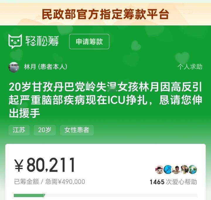 党岭失温女孩父母,网上发布捐款求助。 这个名叫月月的20岁女孩高原徒步失温,被路过的一群好心人救助爱心接力送往医院,因为病情严重已经进入ICU,父母说有可能成为植物人。 由于治疗费用月月父母承担不起,在网上发布视频向广大网友求助,发起的目标49万,已经有爱心网友进行捐款。 当然,网上也有不同的声音出现,说女孩不该以身犯险进行高原徒步,事已至此指责女孩已经无济于事,只能祈祷女孩父母凑够治疗费用,期待奇迹发生女孩能醒过来别成为植物人,毕竟才二十岁。 如果是你,你会尽微薄之力,帮助这个家庭渡过难关吗?
