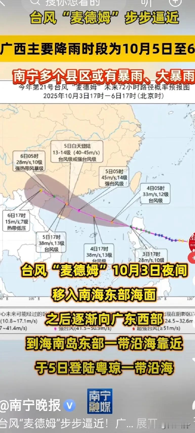 紧急!台风“麦德姆”逼近广东徐闻,今早5时已到这个位置,这些区域需严阵以待 2025年10月4日清晨5时,中央气象台发布最新台风动态:今年第21号台风“麦德姆”的中心,已抵达广东徐闻东偏南方向附近海域,正持续向沿海靠近,一场可能影响华南沿海的风雨考验即将拉开序幕。 从目前监测数据来看,“麦德姆”虽暂未公布具体风力等级与移动速度,但结合往年同期台风路径分析,徐闻及周边的湛江、茂名等沿海城市,接下来24小时内极有可能出现强降雨与8级以上阵风。当地渔民已收到紧急通知,所有近海渔船需在今早8时前全部回港避风,严禁任何船只出海作业;沿海景区也启动临时闭园措施,工作人员正逐一对游客进行疏散引导。 家住徐闻县海安镇的王女士告诉记者,凌晨就听到社区广播反复提醒,“让把阳台的花盆、空调外机支架都检查一遍,还说要提前囤好饮用水和应急食品”。不少居民已行动起来,超市里的手电筒、雨衣、方便面等物资销量明显上涨,部分药店的创可贴、消毒用品也被大量采购。 气象部门特别强调,“麦德姆”移动路径仍存在小幅变数,后续不排除受副热带高压影响,转向或增强的可能。建议广东南部、海南北部的居民,密切关注每小时更新的台风预警,避免前往海边、低洼地带,驾车出行时绕开易积水路段。这场台风会带来多大影响?后续动态我们将持续追踪报道。