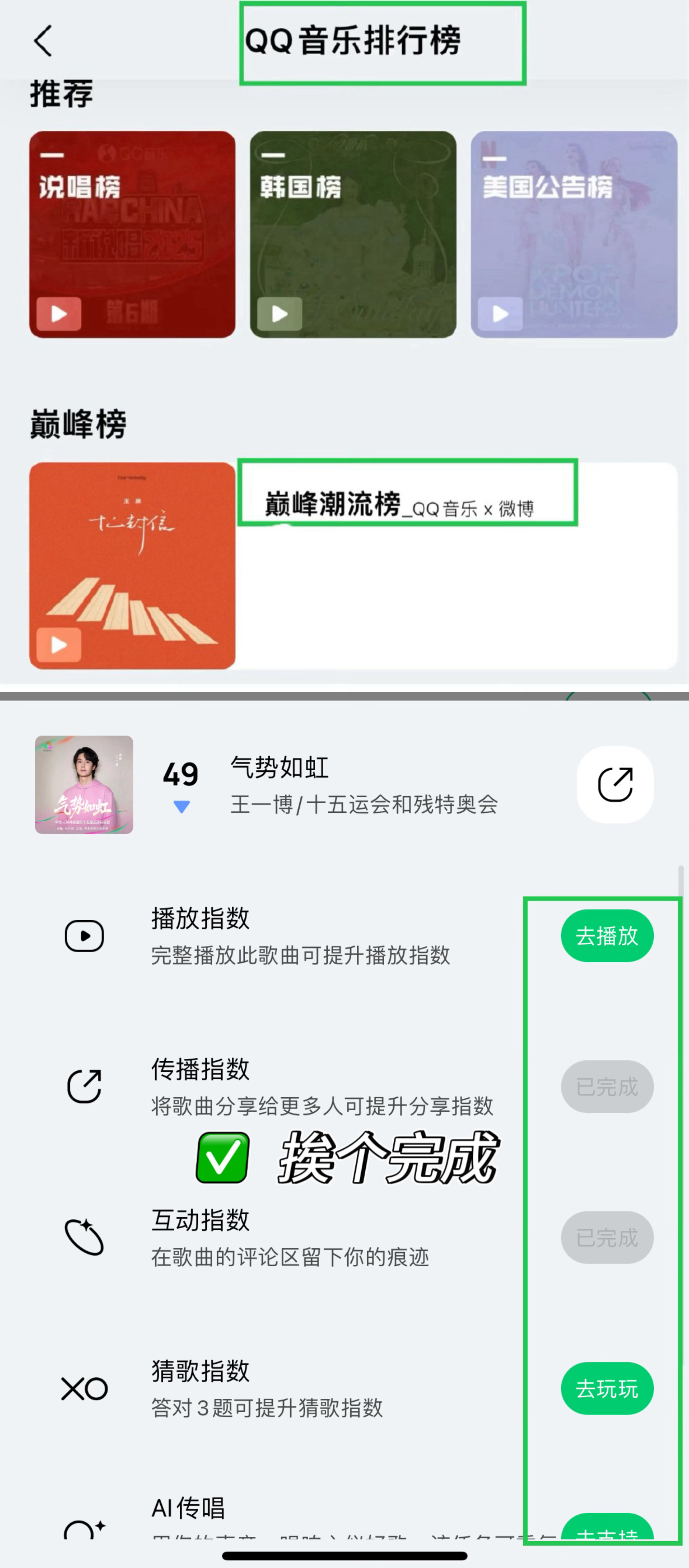 🟢“乐馆”—“排行”—“巅峰潮流榜”—“王一博《气势如虹》——“支持”—“播放、分享、微博评分、互动评论、猜歌”全部做一遍