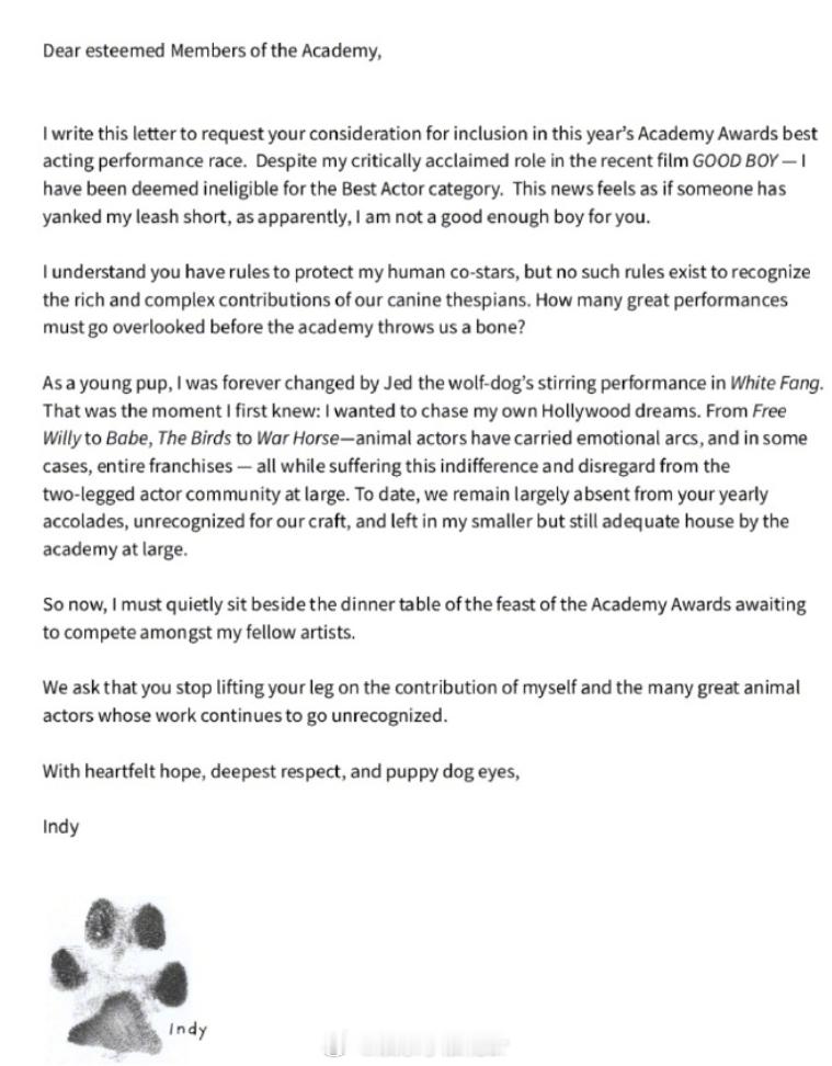小狗提议奥斯卡设立动物表演类奖项 据外媒,恐怖片《好狗狗》主演小狗Indy向美国电影艺术与科学学院写信,提议奥斯卡设立动物演员表演类奖项:“还要有多少出色的表演被忽视,学院才会给我们一点认可呢?”[悲伤][可怜]信的结尾还有庄严签署的小狗爪印,请无偿归还小狗参评奥斯卡的权利!