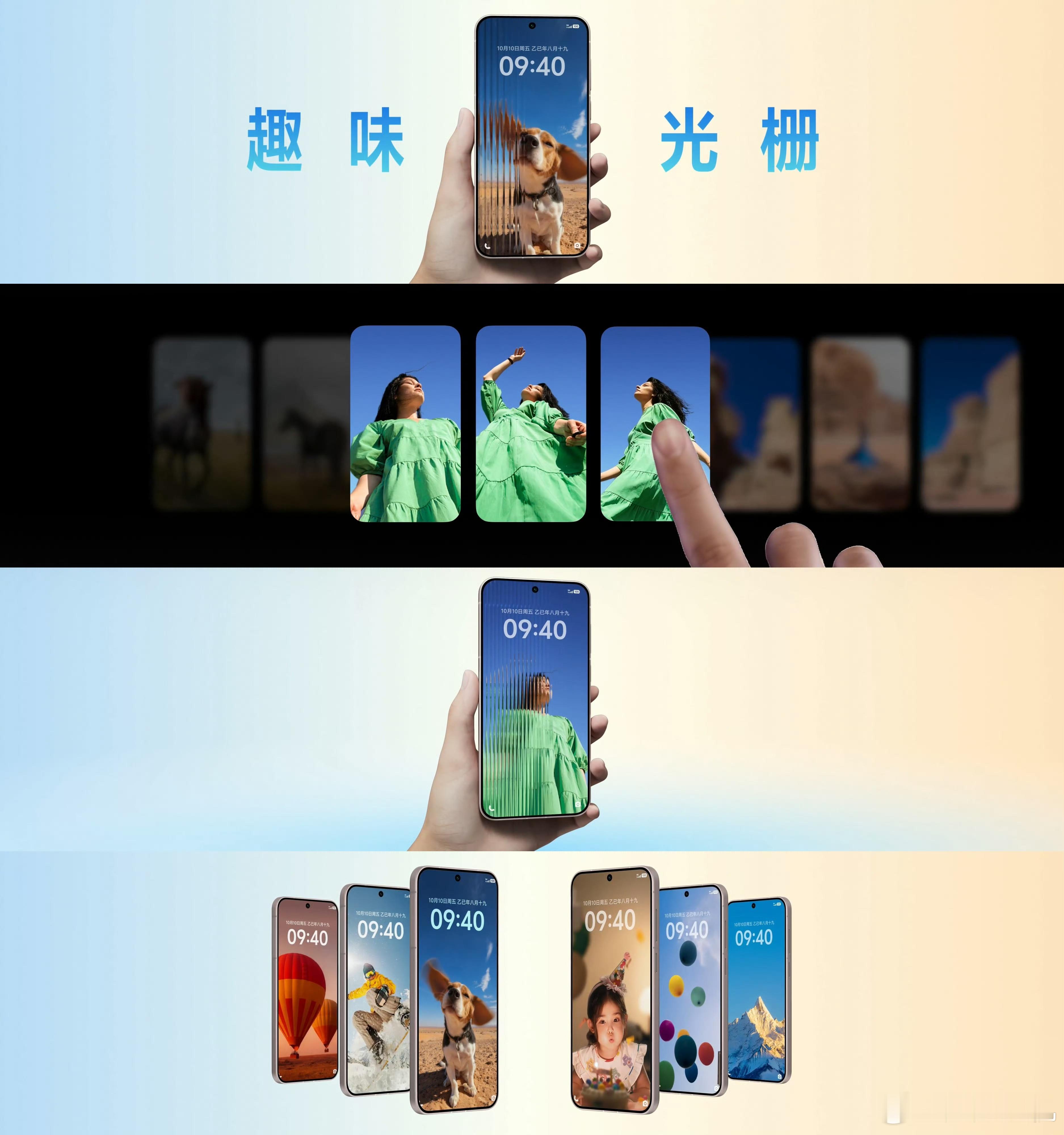 这次在设计上也是升级了全新“动态透彩”材质,同时带来了全新的 “趣味光栅”主题。选择那一些照片, 轻轻变换手机角度,就可以动起来。