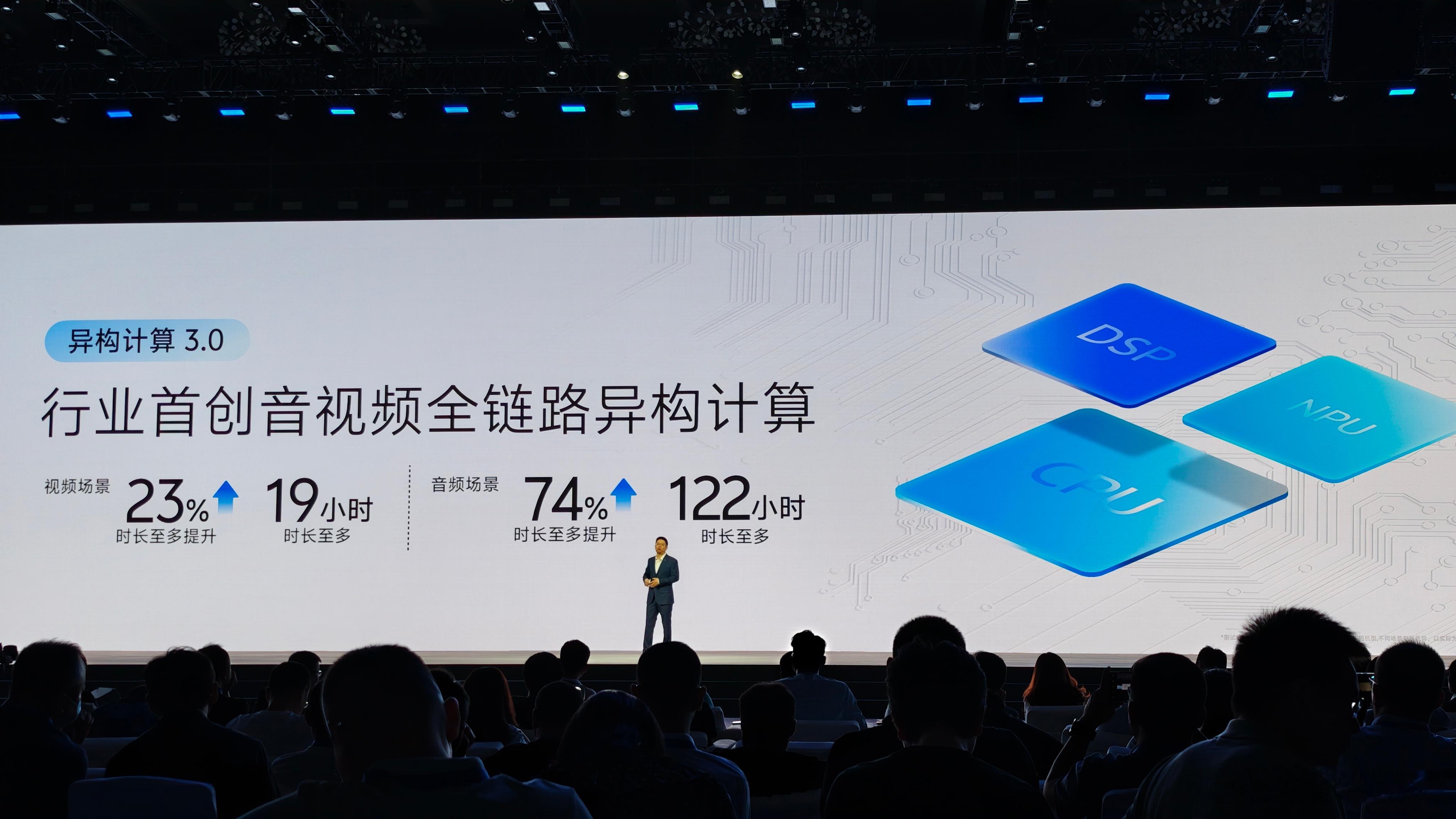 异构计算3.0,行业首创音视频全链路异构计算,看视频时长最高提升23%, 最长可以看19个小时,听音乐时长最高提升74%,最长可以听122个小时。