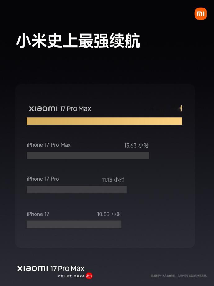 这不对吧?小米17系列发布会官方测试小米17 Pro Max 续航时间是比iPhone 17 Pro Max 续航多6个小时左右的。