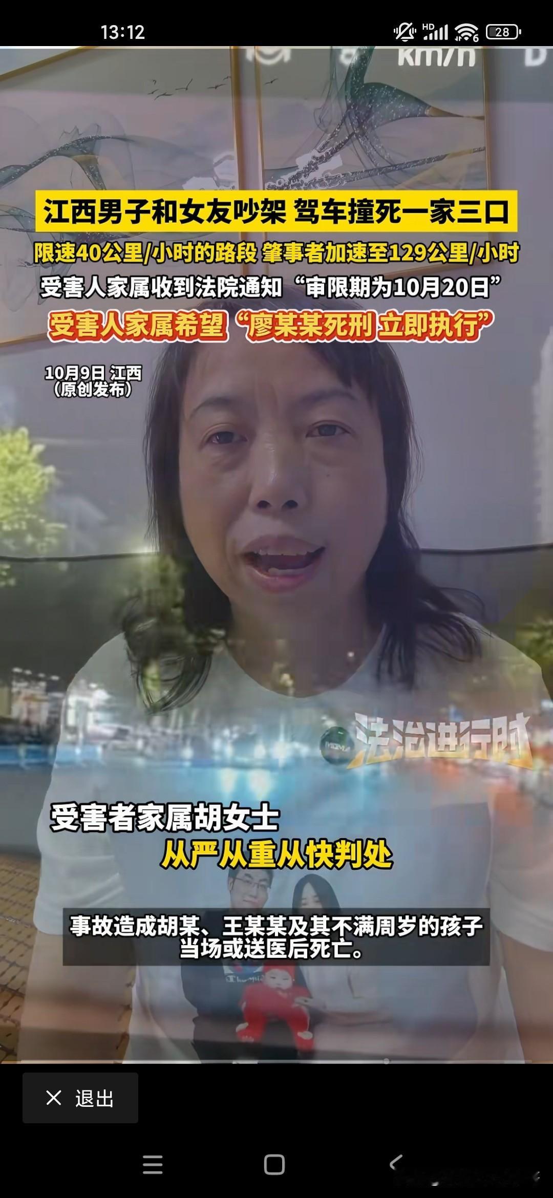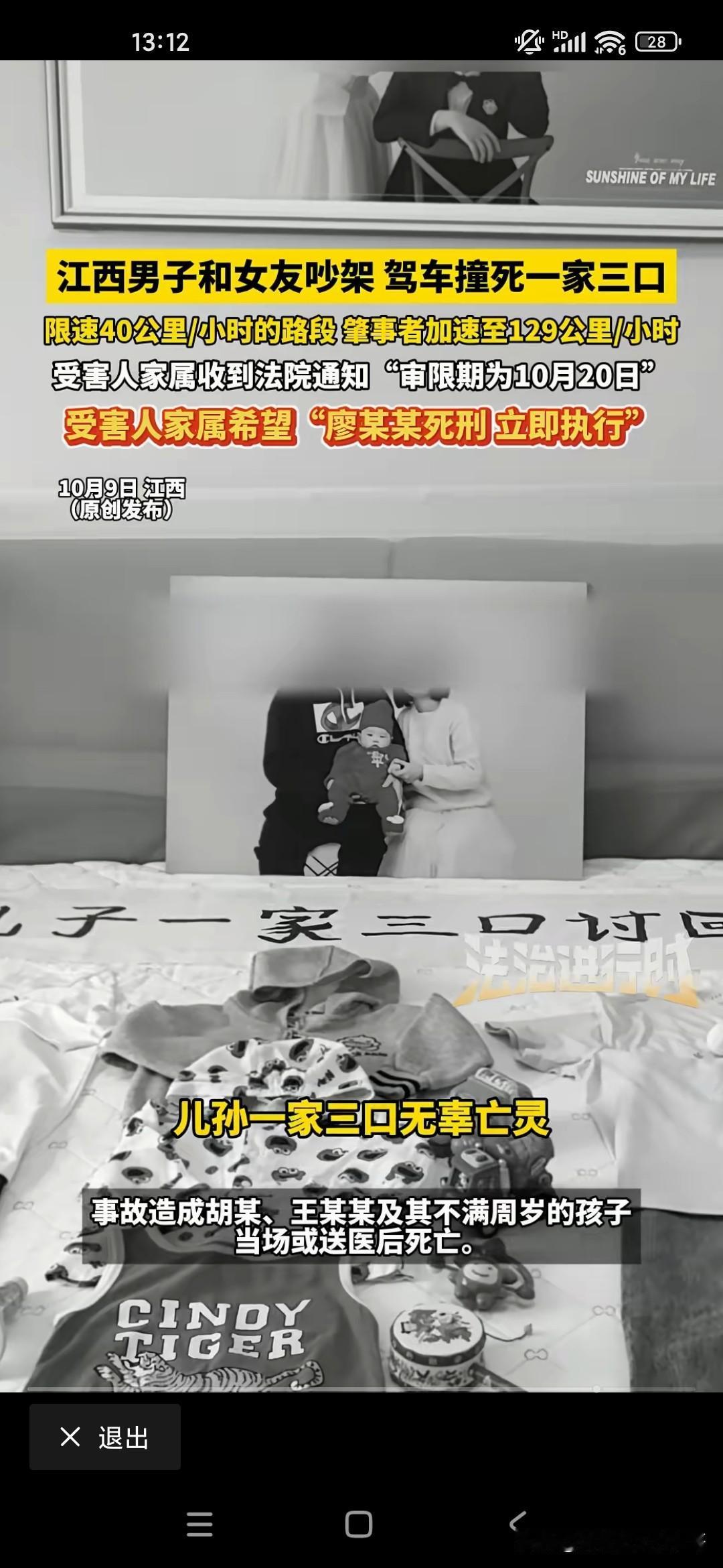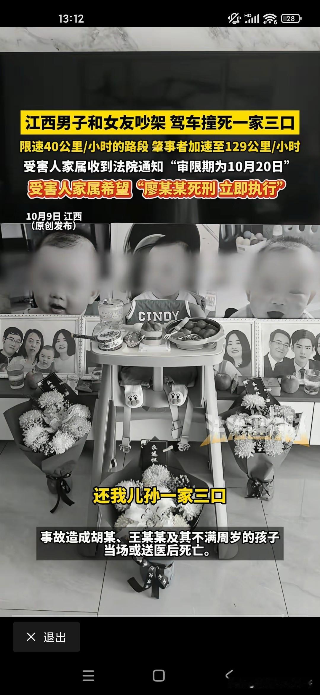 江西景德镇这一家三口的妈妈和奶奶不知道他们将如何度过余生,现在的话,他喘了一口气儿,估计就是为了看到肇事者,凶手判处死刑,但是法院审理的过程以及宣判的过程可能是一个非常漫长的过程,所以说这个老人我看到已经是白发苍苍,但是也没有办法,中国法院这个流程啊比较漫长,所以说一直在等待,一直在等待,家里还共用着这个他儿子,儿媳还有他孙子的遗像,呃,有的时候也想通过哭诉来引起自媒体的这个注意,呃,因为当时这个车限速是40多公里,但是他开到100这家三口死的太可惜了,一想一想这个男子太可恶了,伤及无辜啊,仅仅是因为和女朋友吵架,所以大家在找对象的时候千万不要找一个情绪不稳定的人,这样的话可能会害了大家,不仅害你,还害他!