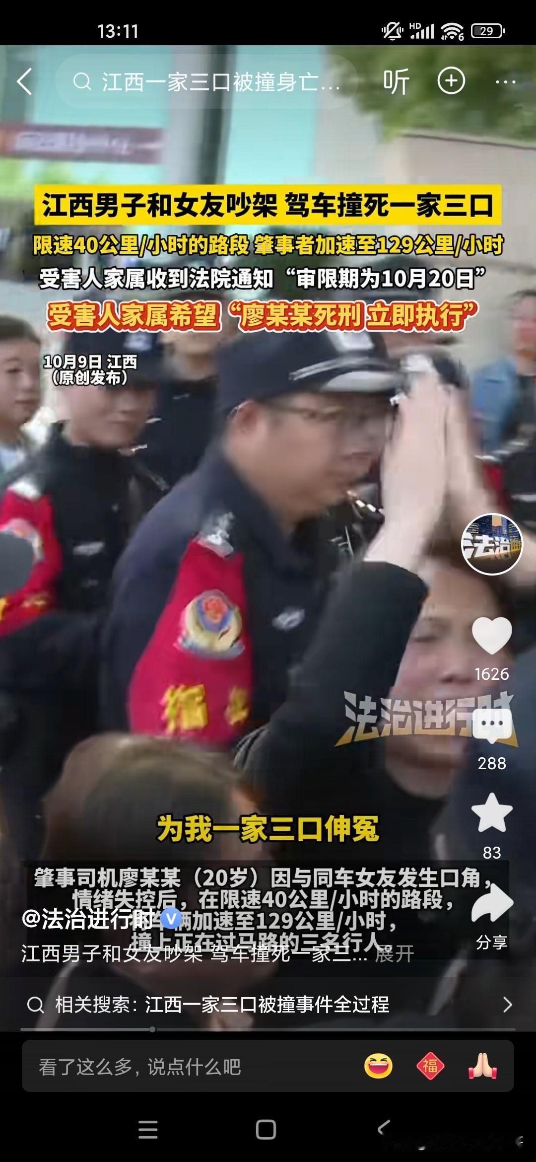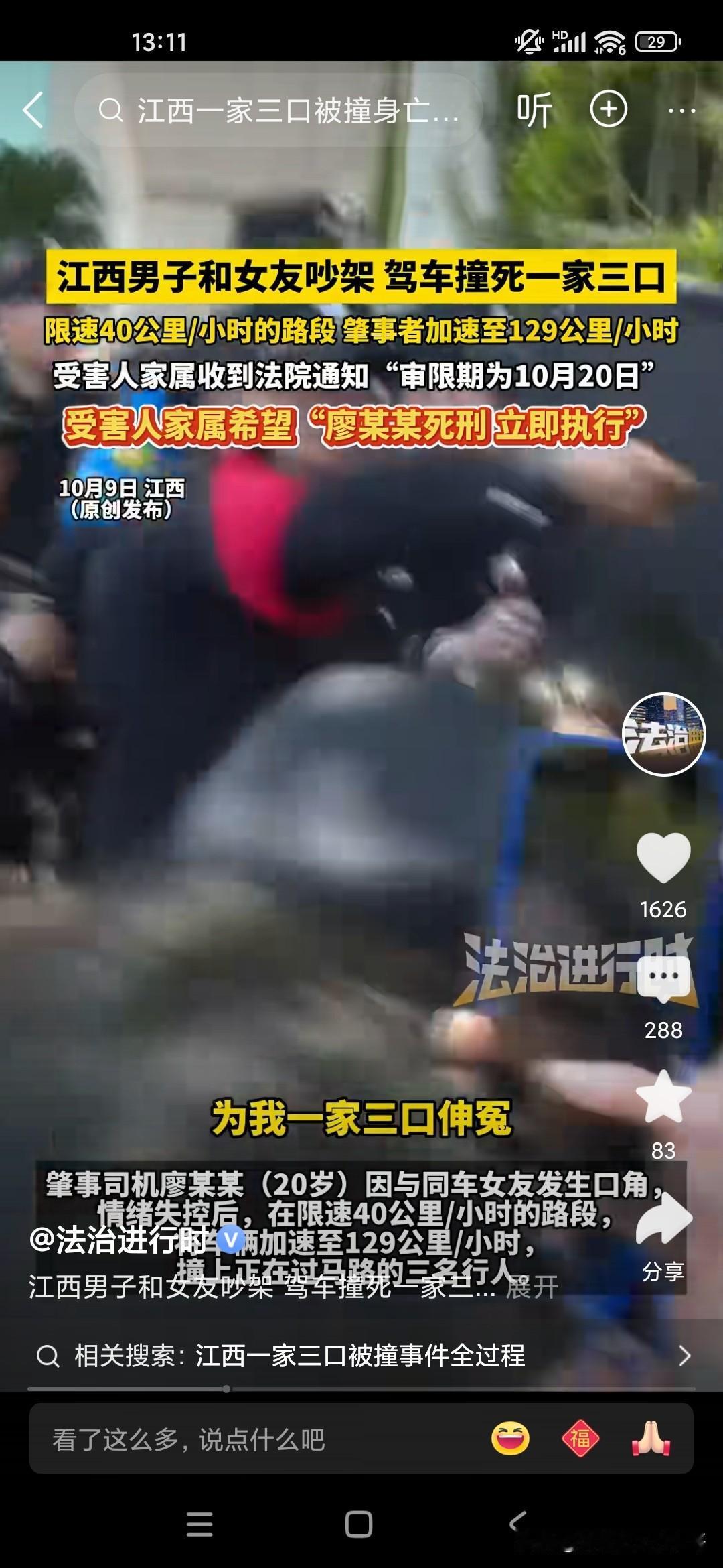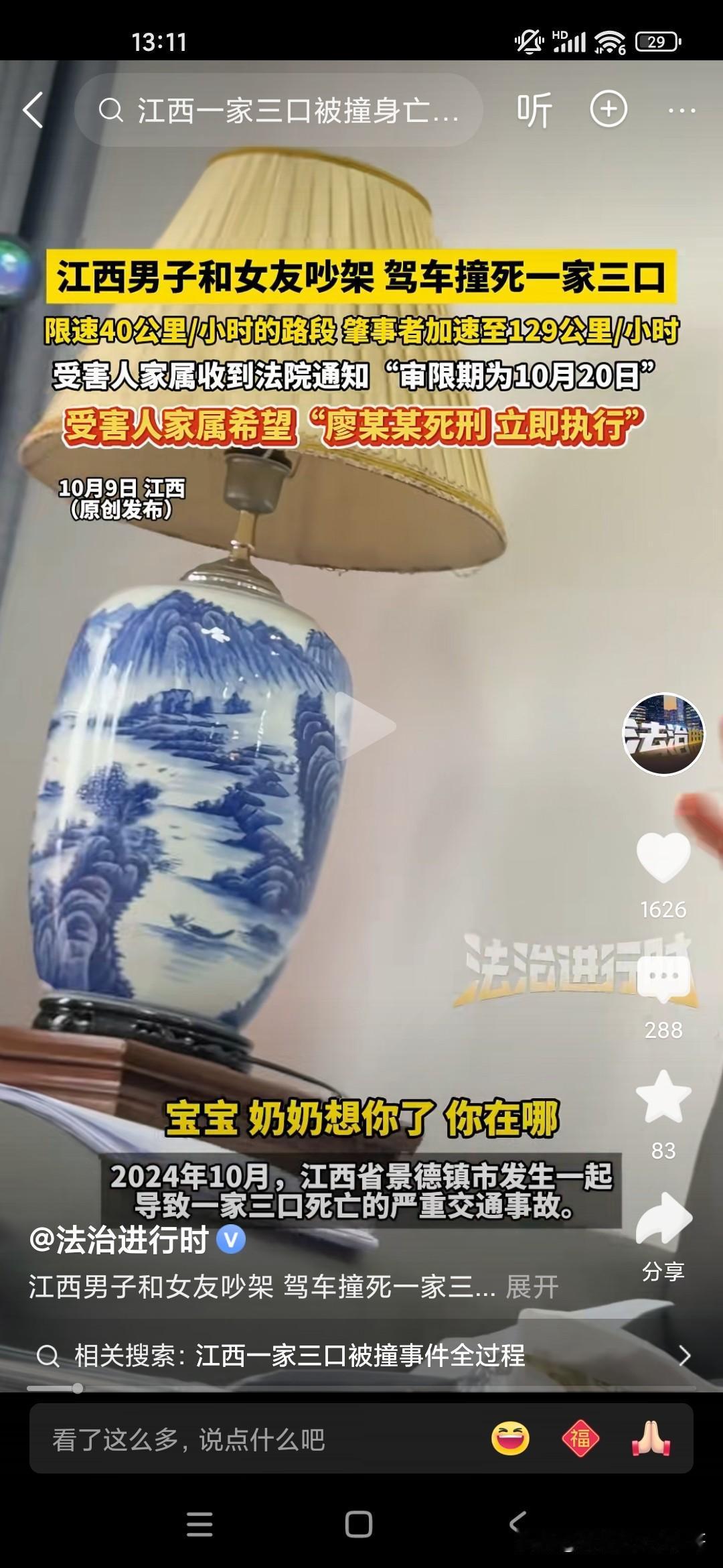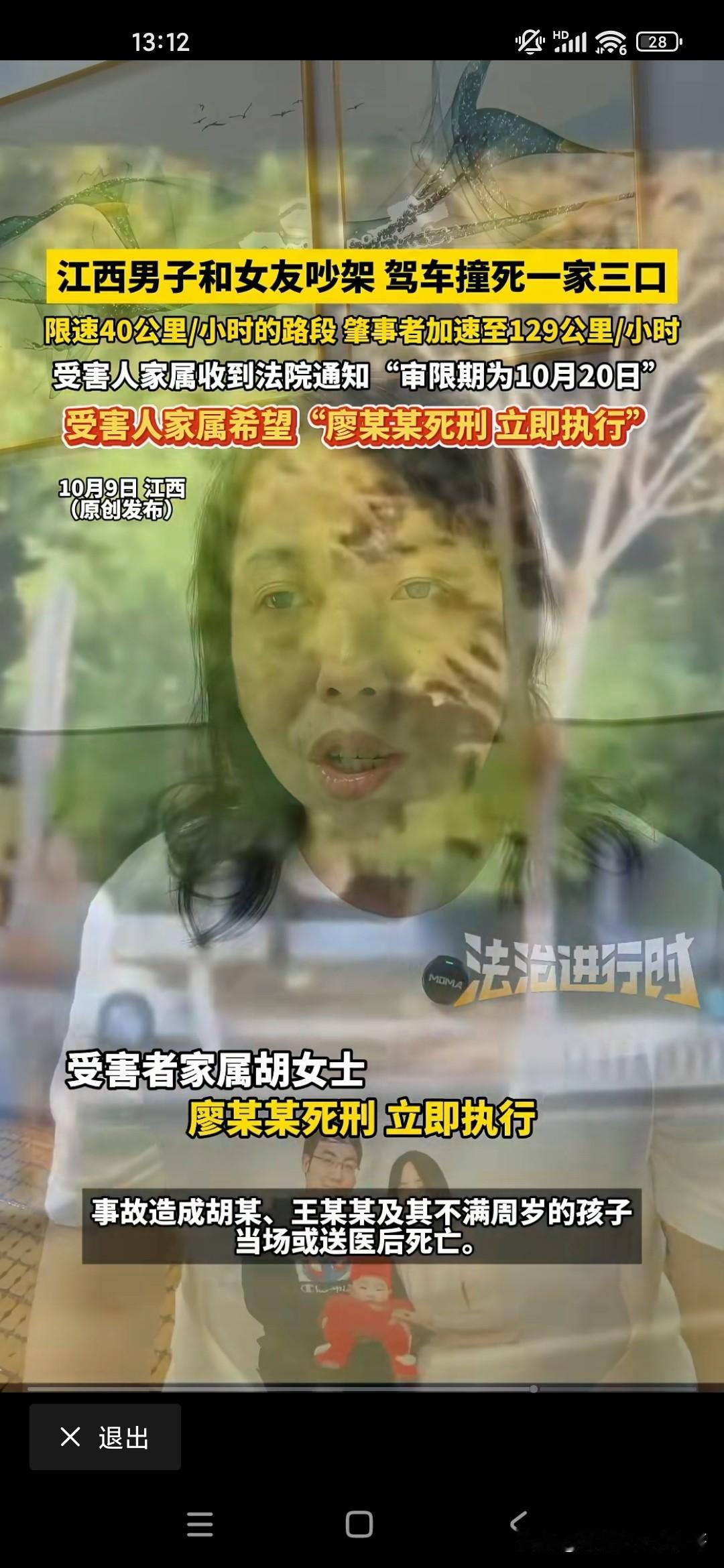 江西景德镇这一家三口的妈妈和奶奶不知道他们将如何度过余生,现在的话,他喘了一口气儿,估计就是为了看到肇事者,凶手判处死刑,但是法院审理的过程以及宣判的过程可能是一个非常漫长的过程,所以说这个老人我看到已经是白发苍苍,但是也没有办法,中国法院这个流程啊比较漫长,所以说一直在等待,一直在等待,家里还共用着这个他儿子,儿媳还有他孙子的遗像,呃,有的时候也想通过哭诉来引起自媒体的这个注意,呃,因为当时这个车限速是40多公里,但是他开到100这家三口死的太可惜了,一想一想这个男子太可恶了,伤及无辜啊,仅仅是因为和女朋友吵架,所以大家在找对象的时候千万不要找一个情绪不稳定的人,这样的话可能会害了大家,不仅害你,还害他!