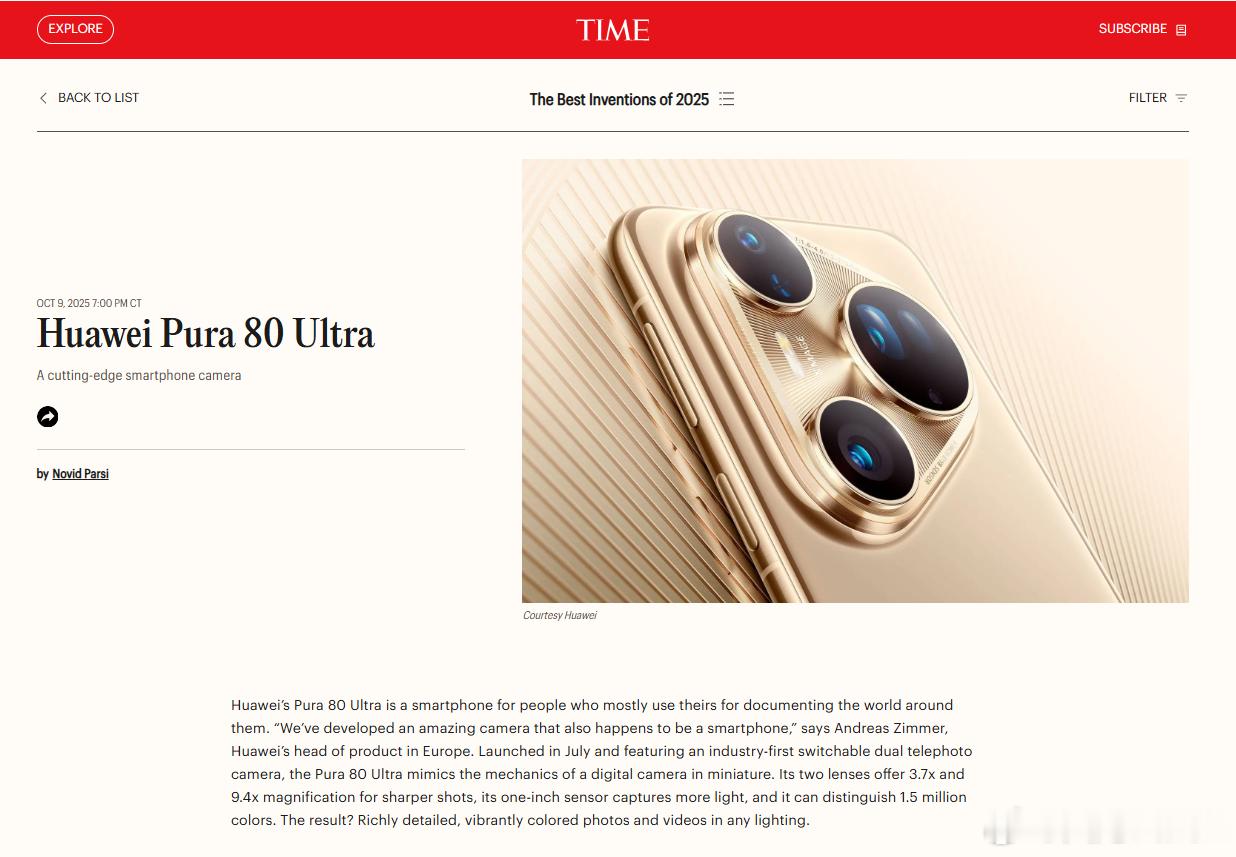 华为苹果同登时代周刊 这次华子厉害了,华为Pura 80 Ultra、华为Watch GT 6 Pro入选《时代周刊》2025 年度最佳发明榜。注意哦,是最佳发明榜。