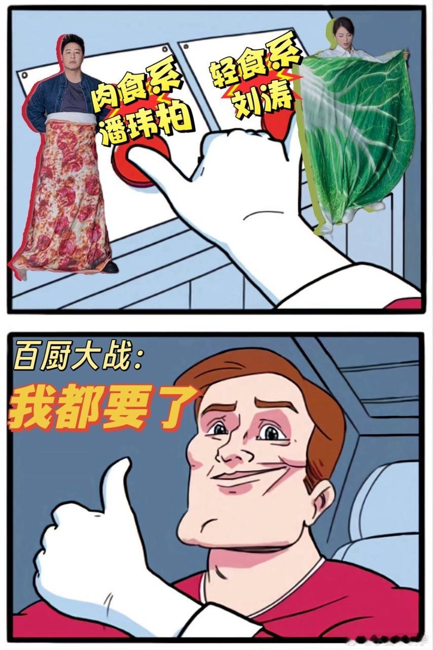 潘玮柏刘涛鸳鸯锅炙热游戏百厨大战 潘玮柏选香肠披萨说减肥,结果秒破功,刘涛选生菜超自律,俩人站一起像营养均衡餐,太有意思了!