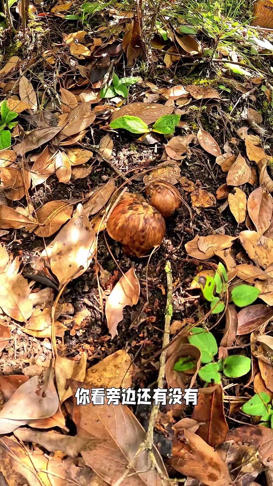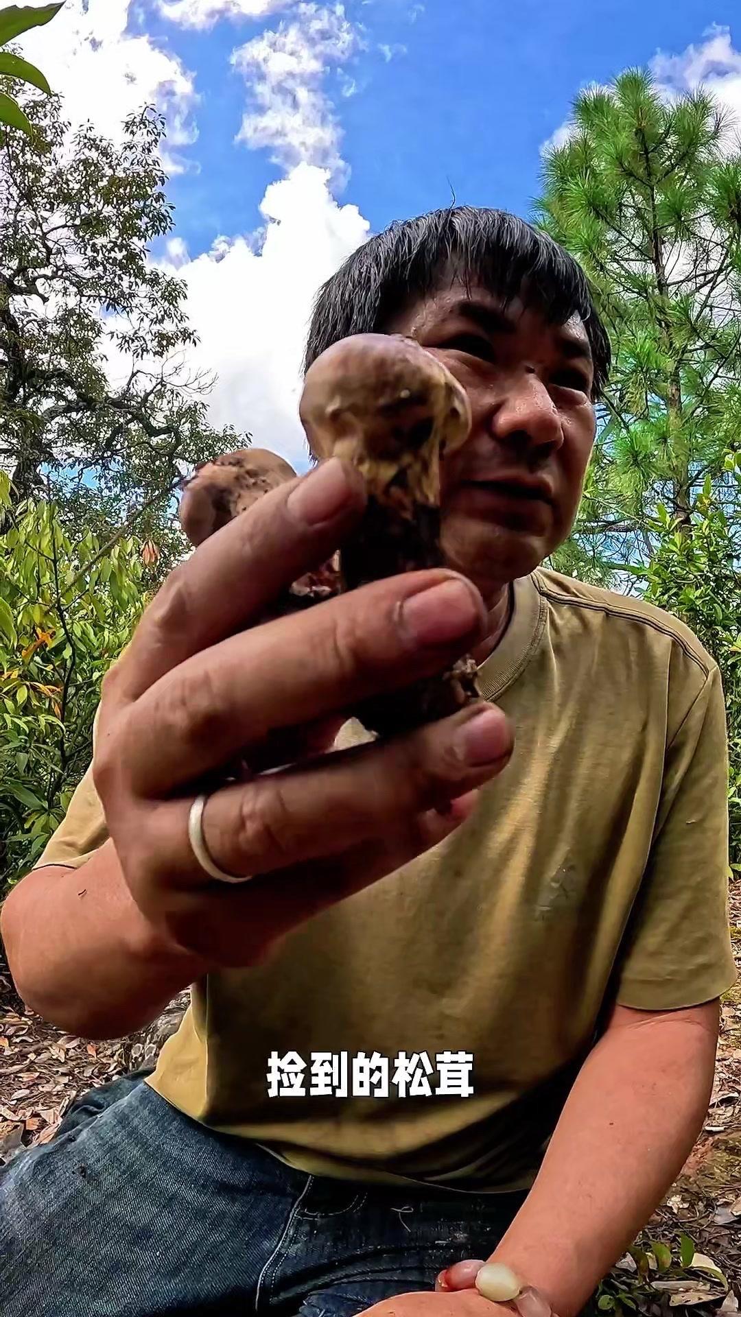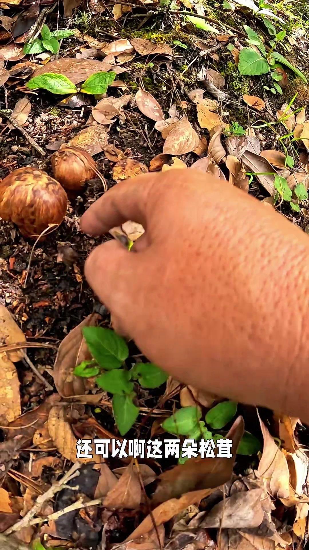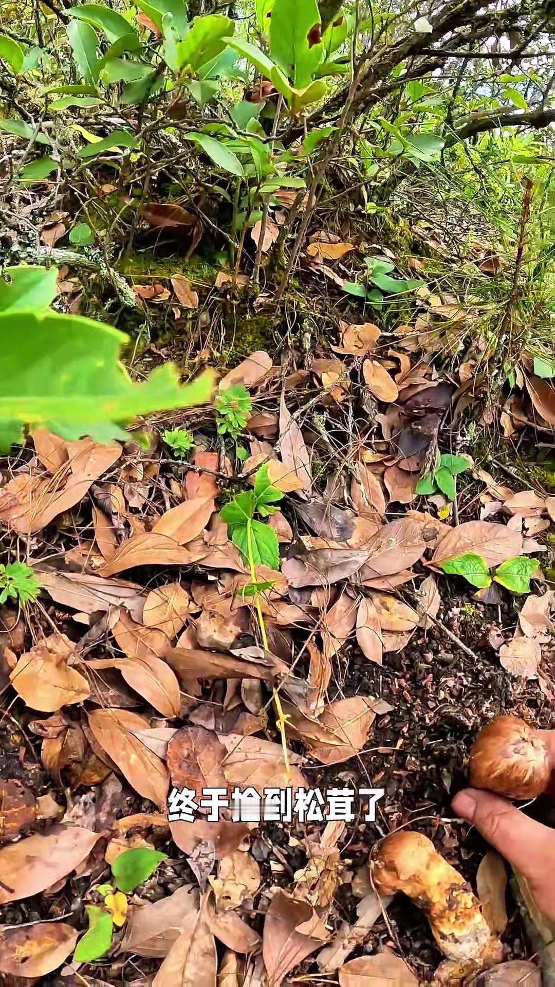 松茸特有的香味太治愈了,闻着就让人满足~不过捡的时候得小心,不能破坏它的生长窝,盖好才能让明年有更多收获呀。 今天的运气真不错,两朵松茸到手,成就感满满!