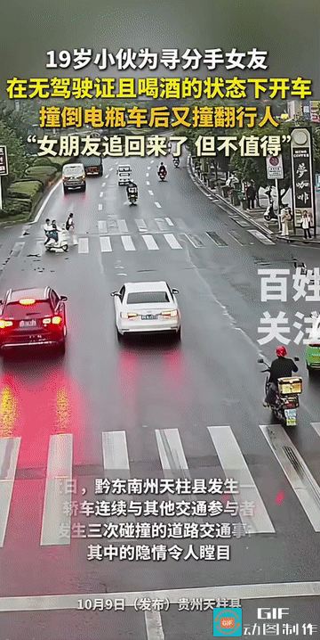 “这还真是为了爱,连命都不要了!”贵州天柱县,一名19岁小伙因女友提出分手,情绪失控之下,竟在无驾驶证且饮酒后驾车外出寻找女友,最终在当地一十字路口酿成连环事故! 来源:【百姓关注】 事发前一晚,小伙饮酒后与女友发生口角。次日清晨6点左右,得知女友提出分手后,他情绪激动,全然不顾自己没有驾驶证且体内酒精尚未代谢完毕的情况,执意驾车前往天柱县城! 在酒精与情绪双重影响下,小伙的驾驶能力严重受损。当他驾车行驶至天柱县天泽郡售楼部路口时,因心急赶路叠加酒精影响,未对斑马线区域谨慎观察! 车辆先与从斑马线过路的电动车相撞,随后失控撞倒斑马线上行人,再与左侧正常行驶车辆发生刮擦! 一次因情绪失控的驾驶决定,在瞬间影响了多位无辜交通参与者的安全! 最后,事故致三名学生受伤,由于伤者目前正在医院进行治疗,事故责任认定正在进一步处理中! 当警方将小伙抓获,询问他女友追回来没,小伙称追回了;但再次询问他值不值得时,小伙却非常坚定的回答着“不值得”! 这“不值得”三个字此时听着却是无比的可笑,事情已经发生了,再来后悔也已经晚了! 根据《中华人民共和国刑法》第一百三十三条之一规定,在道路上醉酒驾驶机动车的,处拘役,并处罚金。 无证驾驶同样面临严厉处罚。根据《道路交通安全法》,公安机关交通管理部门可对无证驾驶人员处二百元以上二千元以下罚款,并可并处15日以下拘留。 如若事故造成人员重伤或死亡,肇事者还可能涉嫌交通肇事罪,面临更高刑罚。 所以,小伙的这一次冲动行事,等待他的也终将是法律的严惩! 通过此事,也再次提醒我们:酒精会严重影响驾驶操作和判断能力,酒后驾车不仅是对自己生命的漠视,更是对他人安全的威胁,方向盘前的情绪控制,与法律敬畏、驾驶技能同样重要!