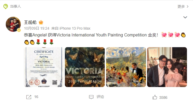 近日,李湘王岳伦这对前夫妻同时发文祝贺女儿王诗龄获得“维多利亚国际青少年绘画大赛”金奖。