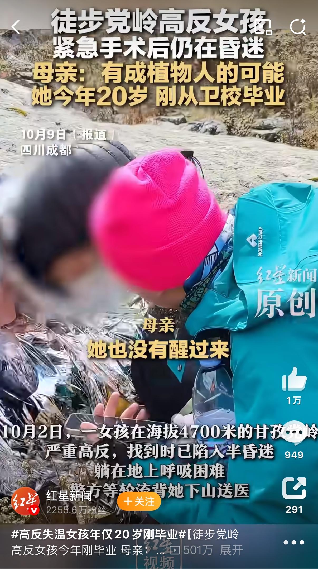 20岁女孩高原遇险:有人撒手跑路,有人拼力相救 刚毕业的姑娘去川西徒步,突然高反加失温,情况特别危急。 让人寒心的是,她在某书找的同行“搭子”,居然把她独自扔下自己下山了。现在年轻人爱找搭子吃饭、旅游、搭车,觉得热闹,可根本不了解陌生人,真出事了哪靠得住? 还好有好心人!16岁少年和两位军医及时救她,后来更多陌生人接力把她送下山。 但现在姑娘还在ICU抢救,没脱离危险。 这事儿也提醒想去高原的人:安全第一,队友靠谱比啥都重要! 你平时会找陌生搭子出门吗?来评论区说说呗。 来源:红星新闻